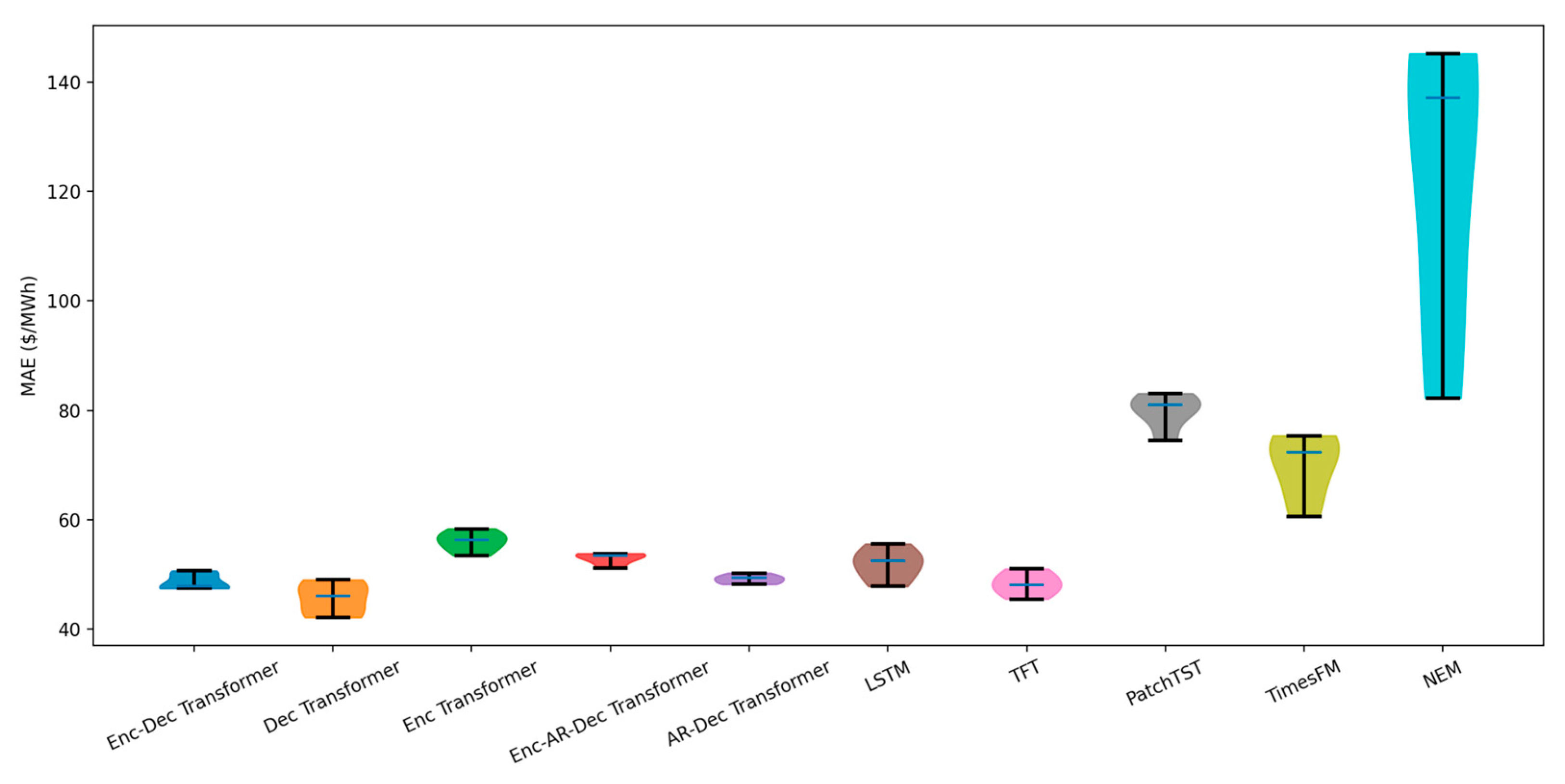 Second, the decoder was configured to use parallel decoding, enabling the model to generate the entire 32-step forecast horizon in a single forward pass. This approach avoids the accumulation of errors inherent in autoregressive decoding and aligns with operational forecasting needs in the NEM, where full multi-horizon price trajectories must be generated simultaneously. To assess the impact of decoding strategy, an additional autoregressive (AR) decoder variant was implemented and evaluated. The AR configuration predicted each future timestep sequentially, feeding earlier predictions back into the model, enabling direct comparison between parallel and AR decoding methods.