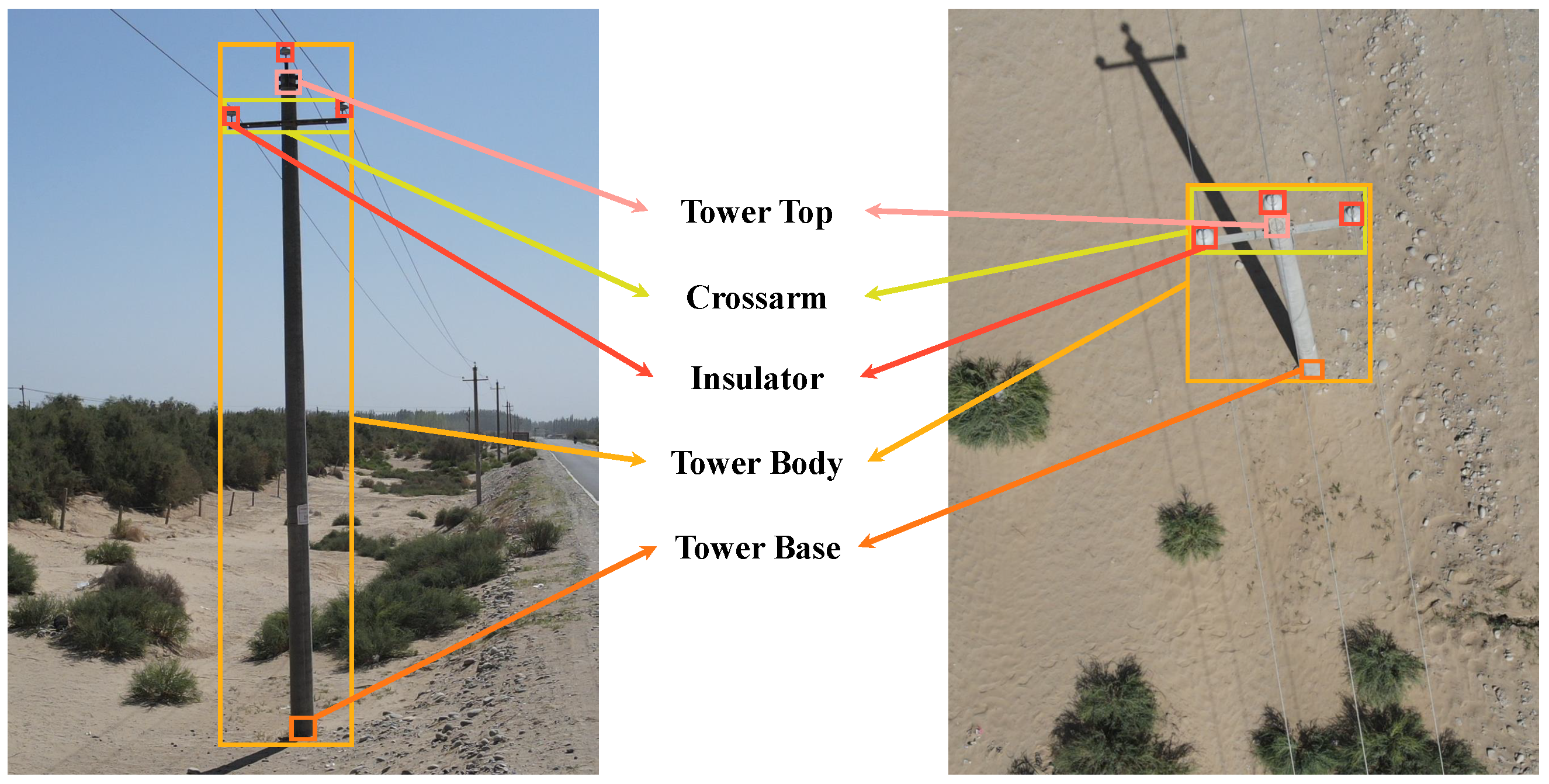 - Ma, W.; Xiao, J.; Zhu, G.; Wang, J.; Zhang, D.; Fang, X.; Miao, Q. Transmission tower and Power line detection based on improved Solov2. IEEE Trans. Instrum. Meas. 2024, 73, 5015711. [Google Scholar] [CrossRef]