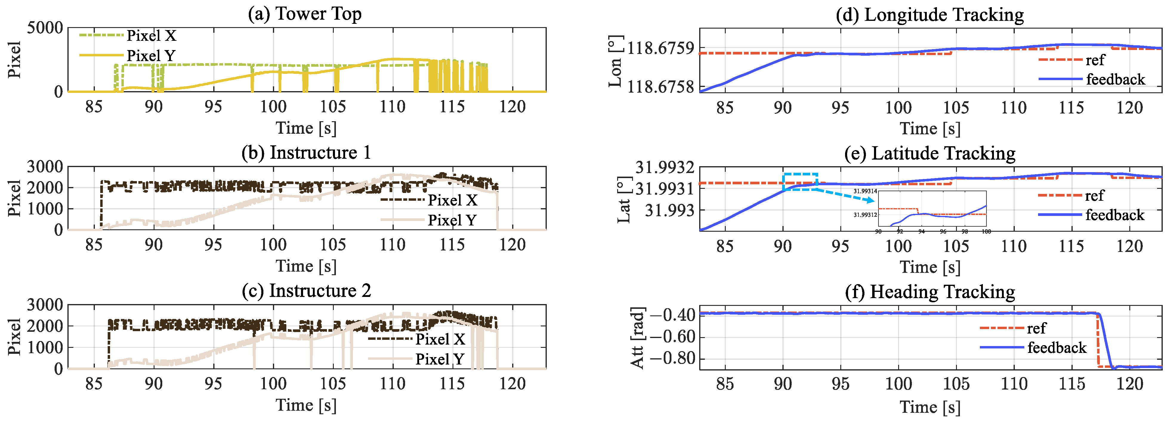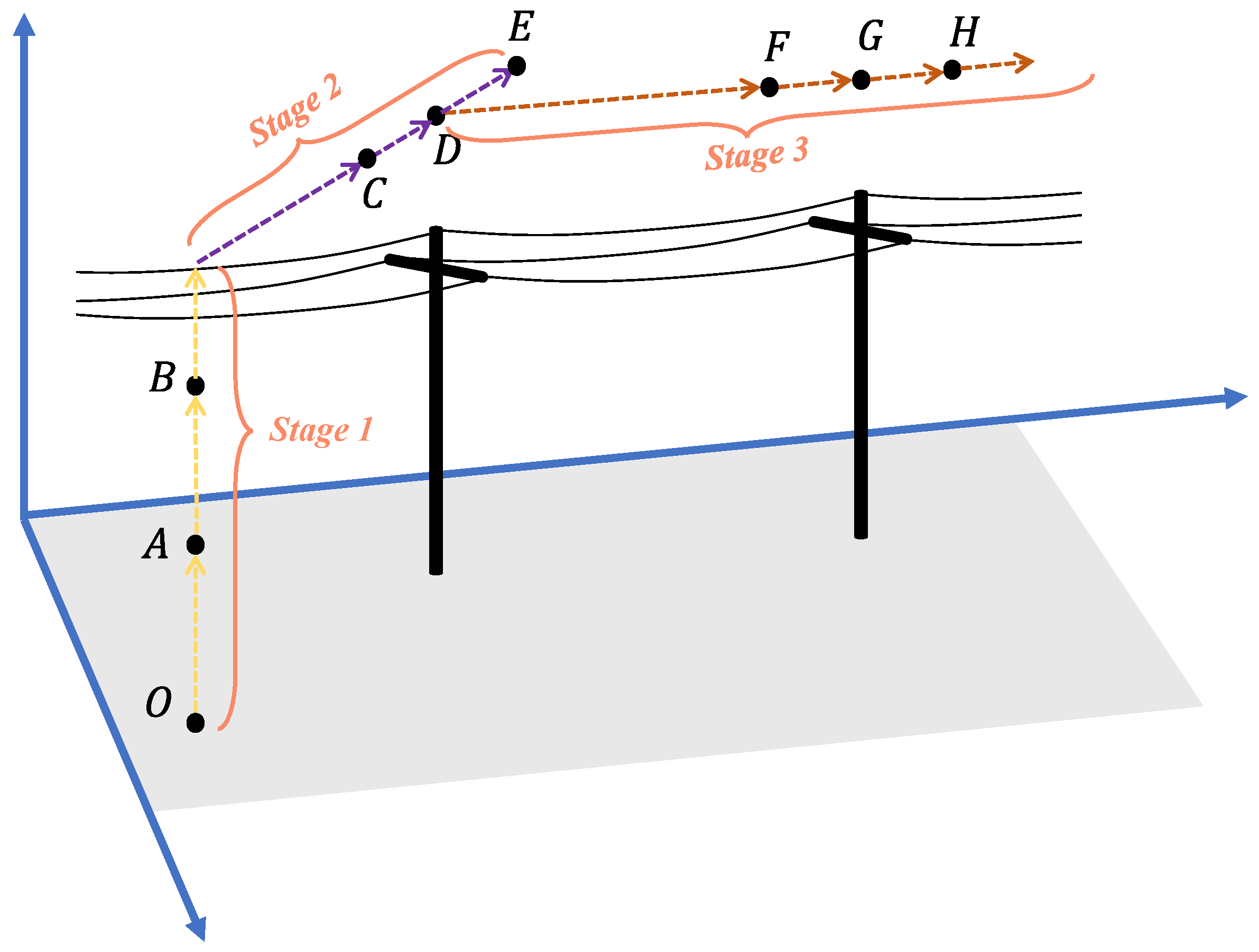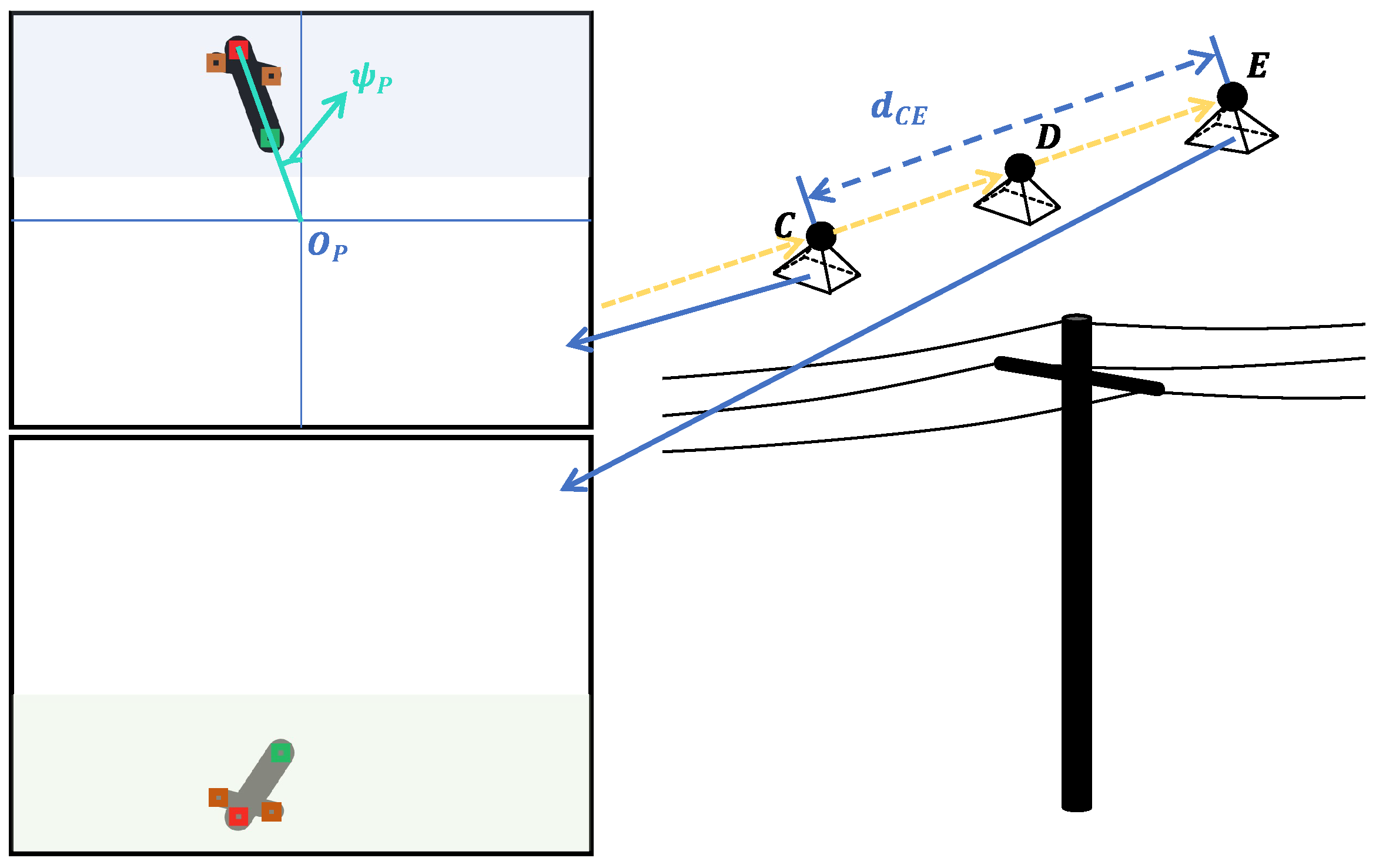 - An inspection waypoint generator is designed, which collects the UAV’s states and detection results at specific intervals, estimates the relative distance between the tower and the UAV by analyzing their relative position and pixel variations, and estimates the tower’s geographic coordinates. The generator operates in three stages: initial tower coordinate estimation, coordinate correction, and refined tower coordinate estimation.