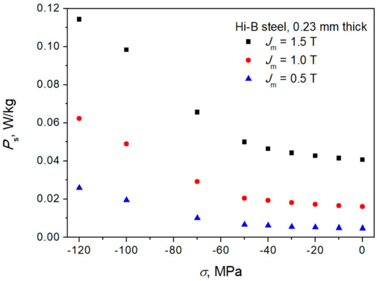 Figure 3 depicts exemplary measured hysteresis curves at different arbitrarily chosen values of the compressive stress. The amplitude of polarization was set at 0.5, 1.0, and 1.5 T. The shapes of hysteresis curves for lower values of applied compressive stress ( MPa) do not differ much from that for 0 MPa; on the other hand, the distortion of the shape of hysteresis curves at σ = −120 MPa is clearly visible. The excitation frequency was set up to 5 Hz in order to avoid the effect of eddy currents on the loop shape. The value 5 Hz is the lowest admissible value in the system.