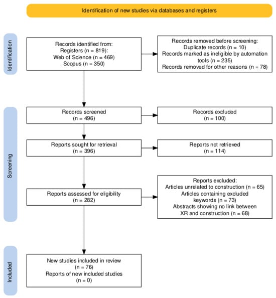 | Keywords | Include terms related to construction and XR (e.g., “construction industry”, “virtual reality”, “augmented reality”, “mixed reality”, “BIM”, “Building Information Modeling”, “Industry 4.0”). | Contain excluded terms that indicate a different primary focus (e.g., “digital twin” without explicit XR, “aerospace”). |