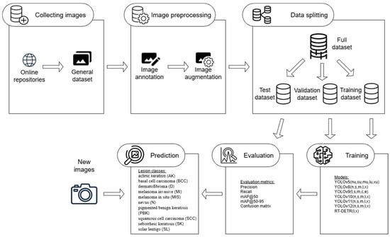 Every image chosen from the ISIC dataset was marked with bounding boxes using website computing vision tools from Roboflow company. Images were pre-labeled by licensed dermatologists and this way it was known what lesion contained the given image. Background images were obtained by cropping fragments of healthy skin without any lesions from skin images with high resolution. Background images often contain short hair from different body parts like legs or arms. Originally numbers of images per class varied from 662 to 1001. Therefore, classes dermatofibroma (662 images) and solar lentigo (711 images) were augmented using the Albumentations 1.3.1 library to increase the number of images from each class to 1000. The transformations performed during augmentation were SafeRotate and ShiftScaleRotate. The entire process flow of the research, including data collection, annotation, augmentation, and splitting, followed by model training and evaluation, is presented schematically in Figure 1.