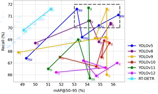 The multi-stage selection procedure for the optimal model begins with an evaluation of key performance metrics that are fundamental to object detection tasks. Figure 3 presents a graphical comparative analysis of all 32 tested models, plotting their ability to detect existing lesions (Y-axis: Recall, %) against the precision of their localization (X-axis: mAP@50–95, %). In this metric space, the most desirable models are those positioned in the top-right corner of the plot, as they offer the best trade-off between high sensitivity and precision. Based on this analysis, a region was delineated (marked with a dashed line) that groups the models with the most balanced and promising characteristics. This initial filtering stage allowed for the selection of nine candidates for further, more detailed investigation: YOLOv5su, YOLOv5lu, YOLOv5xu, YOLOv8s, YOLOv8l, YOLOv8x, YOLOv9c, YOLOv11l, and YOLOv11x. Equally important was the rejection of architectures that did not meet these balanced criteria. For example, the RT-DETR models demonstrated high recall at the expense of low mAP, while the YOLOv10 and YOLOv12 models showed the opposite, equally undesirable, trend. This step was crucial for narrowing the analysis down to the models with the greatest practical potential, which will now be subjected to a detailed evaluation based on the metrics presented in Figure 3.
