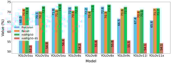The detailed metrics for the nine selected models are presented in Figure 4. Overall, the YOLOv5 and YOLOv8 architectures demonstrated the strongest performance. YOLOv5xu achieved the highest overall mAP@50 (74.0%) and mAP@50–95 (56.4%). However, several other models showed competitive Recall scores, including YOLOv11x (71.7%), YOLOv5su (71.6%), and YOLOv9c (71.6%).