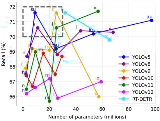 Following the detailed analysis of the performance metrics for the nine leading models, the next stage is to evaluate their computational efficiency, which is critical from the perspective of practical clinical implementation. Figure 5 illustrates the relationship between detection effectiveness (Y-axis: Recall, %) and model complexity, expressed in millions of parameters (X-axis). In this context, we aim to select models located in the top-left corner of the plot, which combine high performance with low complexity, thereby ensuring efficiency and a reduced demand for hardware resources. To perform an objective and systematic reduction in the number of candidates, a strict criterion was established: a model had to achieve a Recall of at least 70% while simultaneously having a parameter count not exceeding 30 million. The area that meets these conditions has been clearly marked on the plot with a dashed line. Applying this filter to the nine models qualified in the previous stage allowed for the selection of a final four that best balance high performance with low complexity. Thus, the models that qualified for the final comparative analysis were: YOLOv5su, YOLOv8s, YOLOv9c, and YOLOv11l.
