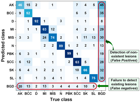 Figure 7 presents the confusion matrix with the errors made by the model. Starting with the AK class, the model detected and correctly classified the lesion in 46 cases, failed to detect it in 26 cases (marking it as background), and misclassified it in 35 cases. For the BCC lesion, the model correctly detected and classified it in 52 cases, marked it as background in 13 cases, and misclassified it in 39 cases. For the D lesion, the model correctly detected it in 92 cases, marked it as background in 2 cases, and misclassified it in 6 cases. The model correctly detected the MI lesion in 63 cases, detected a lesion in 13 images that did not contain one, and misclassified the lesion in 33 cases. For MIS, the model correctly detected the lesion in 74 images, did not detect a lesion in 3 images, and misclassified it in 23 images. For N, the model correctly detected the lesion in 89 images, marked 4 as background, and misclassified the lesion in 7 images. For PBK, the model correctly detected the lesion in 99 cases, failed to detect a lesion in 4 cases, and misclassified it in 3 cases. For SCC, the model correctly detected the lesion in 63 images, marked 4 images as BGD, and incorrectly classified 33 images. For the SK lesion, the model correctly detected it in 66 images, failed to detect it in 10 images, and misclassified it in 34. Finally, for the SL lesion, the model correctly detected it in 75 images, did not detect any lesion in 5, and misclassified 20 images. As we can see, the model performed best on the PBK lesion, detecting and correctly classifying it in 99 cases with 7 mistakes. It performed worst on the AK lesion, detecting it in only 46 cases with 55 mistakes.