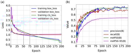 Figure 8a shows the detection and validation loss for the box, as well as the loss and validation for the classification of diseases. As we can see, the box validation loss decreases until epoch 50 and then does not change, so this is the optimal point for box detection. For classification, the validation loss decreases until epoch 75 and then slightly increases, so the most optimal number of epochs is 75. Figure 8b shows the values of individual metrics based on the number of epochs. The values of these metrics grow sharply until epoch 50, after which their rate of improvement slows slightly until epoch 75. After this number of epochs, the values no longer grow as quickly, so the best choice is 75 epochs.