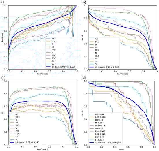 Figure 9a shows the change in precision based on confidence. As we can see, at a confidence threshold of 1.000, the model reaches a precision of 0.99 for all classes. This means that when the model is 100% certain, it has almost no false positives, but it also means that many objects will be missed. Figure 9b shows the change in recall based on confidence. At a threshold of 0.000, the model achieves a very high recall (0.89), which means it failed to indicate a skin lesion in only 11% of cases. However, this comes with a very large number of false positives because the model accepts all predictions, even uncertain ones. Figure 9c shows the change in F1 score based on confidence. As we can see, at a threshold of 0.340, the model gets an F1 score of 0.69, which means that at this point, the model achieves the best balance between recall and precision. Figure 9d shows the change in precision based on recall. And as we can see, the model achieved an mAP of 0.725 for all classes, assuming an IoU of 0.5.