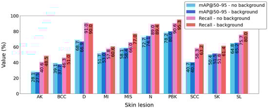 At the final stage of the research, the impact of background images on the obtained results was determined. For this purpose, the model considered to be the best (YOLOv9c) was trained without background images and then evaluated using the test set. During the evaluation, the same quality metrics were taken into account as in the previous analyses, namely mAP@90–95 and Recall. Regarding mAP@90–95, the use of background images caused a slight increase in this index, from 55.3% to 55.5%. A significant improvement, however, was observed in the case of Recall, which increased from 66.7% to 71.6% (an increase of 7.4%). Such a change is of considerable importance for patients from a medical standpoint. Figure 10 shows the impact of background images on mAP@90–95 and Recall for individual classes of skin lesions. Among the ten examined classes, as many as nine showed an increase in Recall after including background images.