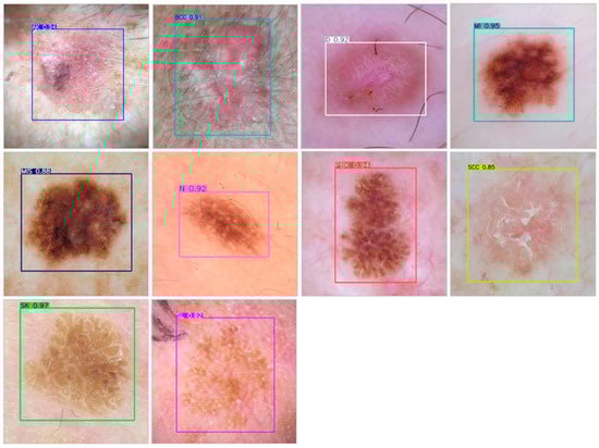 Example results of correct skin lesion detection by the YOLOv9c model. The images subjected to prediction had different resolutions. To facilitate observation of the results, they were cropped with an aspect ratio of 1:1.