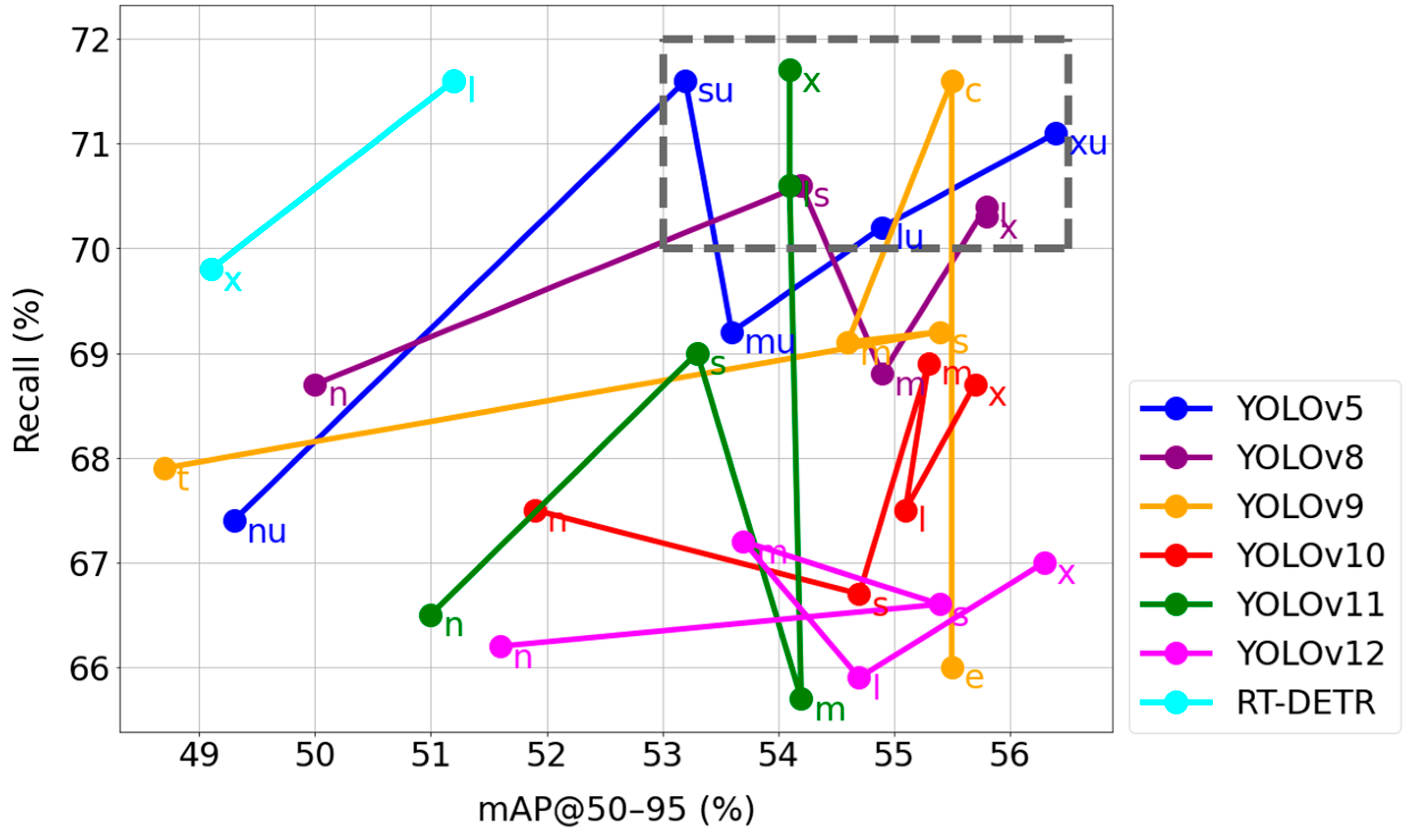 - A large-scale benchmark of 32 state-of-the-art object detection models. This study provides a comprehensive comparative analysis of modern architectures, primarily from the YOLO family (v5–v12) and RT-DETR, establishing their true effectiveness on a challenging, multi-class medical imaging task.