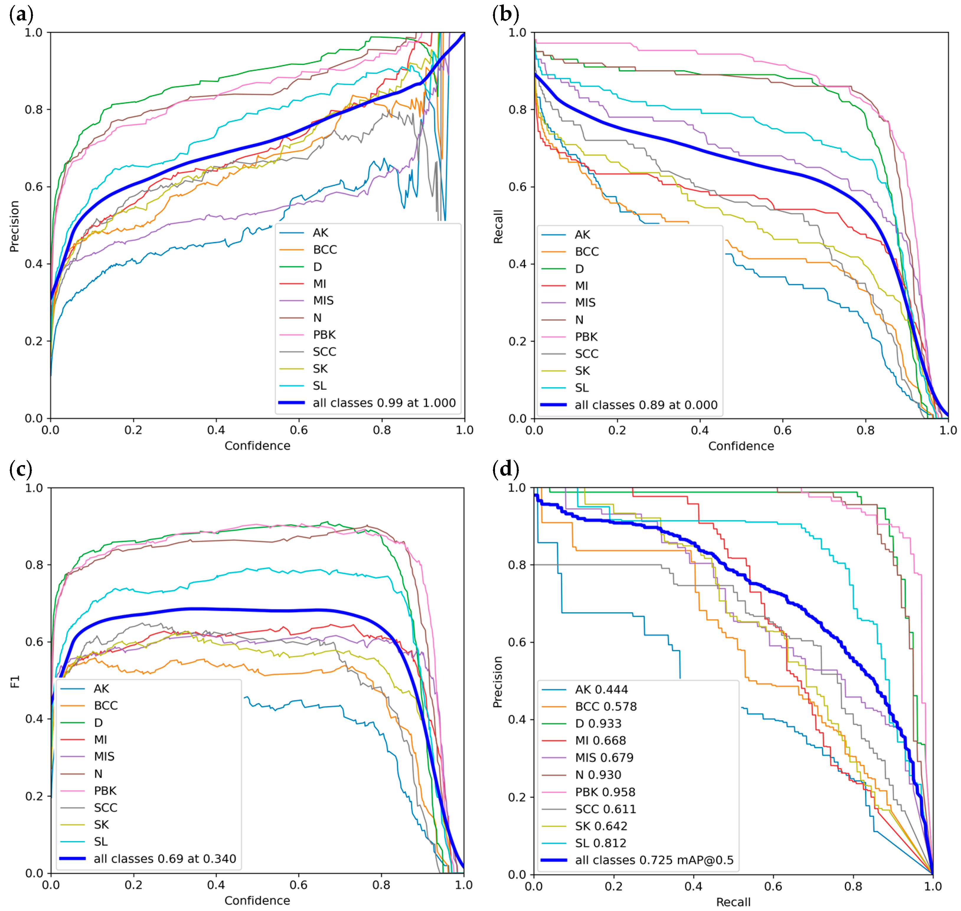 - Riyadi, M.A.; Ayuningtias, A.; Isnanto, R.R. Detection and Classification of Skin Cancer Using YOLOv8n. In Proceedings of the 2024 11th International Conference on Electrical Engineering, Computer Science and Informatics (EECSI), Yogyakarta, Indonesia, 26–27 September 2024; pp. 9–15. [Google Scholar] [CrossRef]