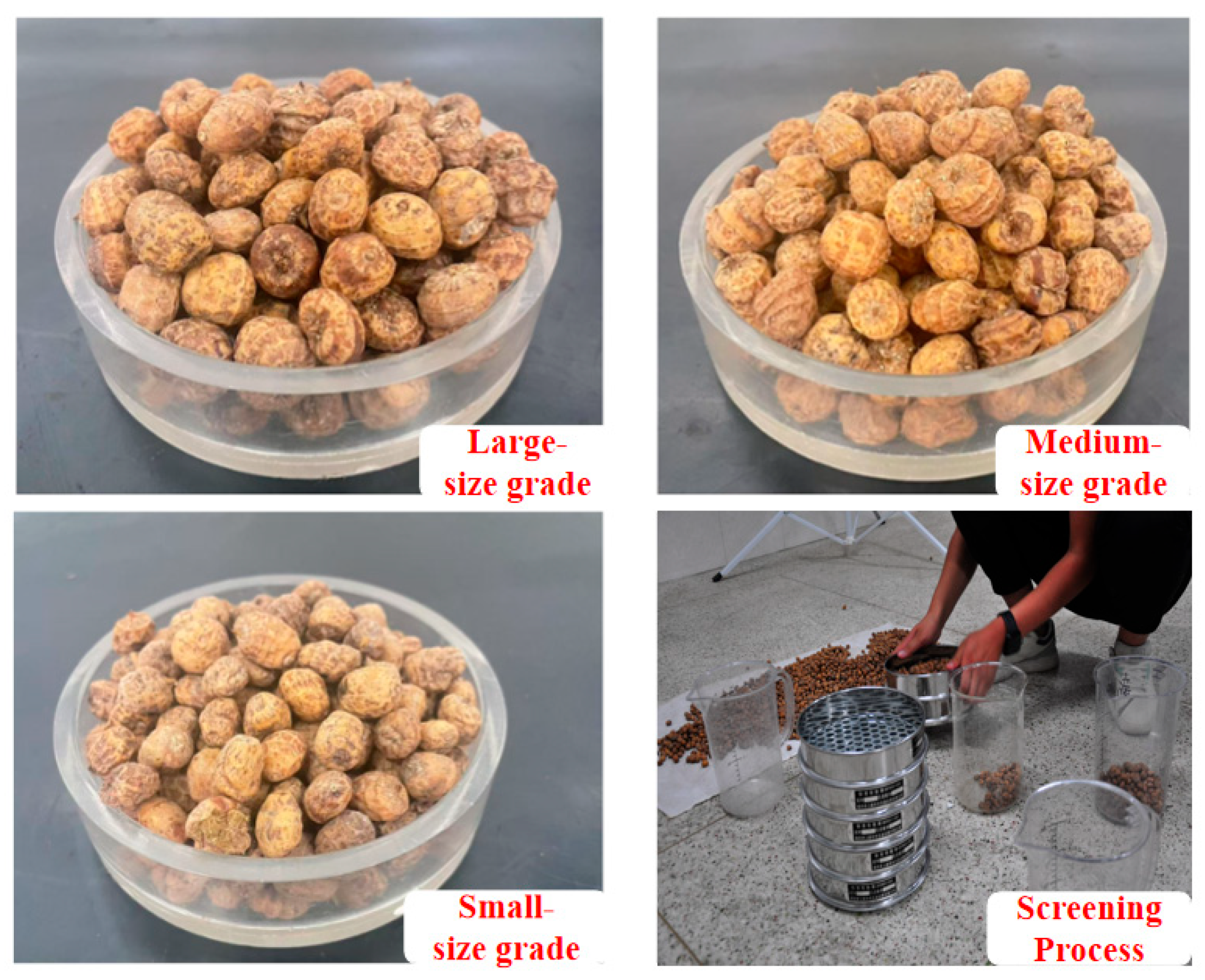 C. esculentus seeds soaked for 48 h under standard environmental conditions were used and classified into three size grades using a three-tier sieve system: