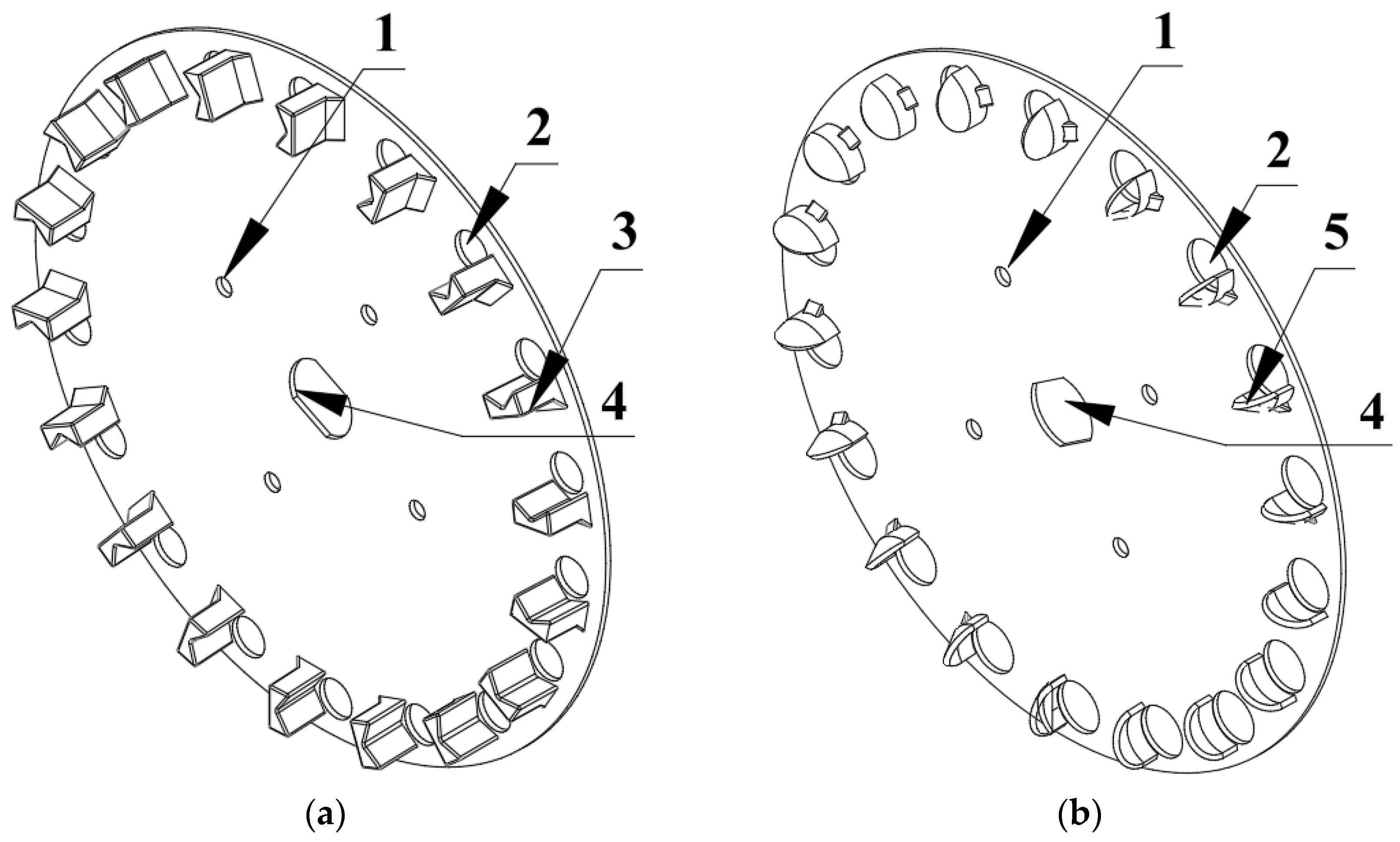 28]. However, having an excessive number of suction holes is not necessarily beneficial. If the number of suction holes is too high, the spacing between adjacent holes becomes too narrow, increasing the risk of airflow interference or mechanical collision when seeds are being adsorbed by neighboring holes. Additionally, this may place a greater load on the blower, potentially leading to issues such as missed seeding or multiple seeding, thereby compromising seeding quality. Therefore, achieving a rational coordination between the number of suction holes and the rotational speed of the seed metering disc is a critical design consideration for ensuring efficient and stable operation of the seed metering device. This relationship can be expressed by Equation (1) [