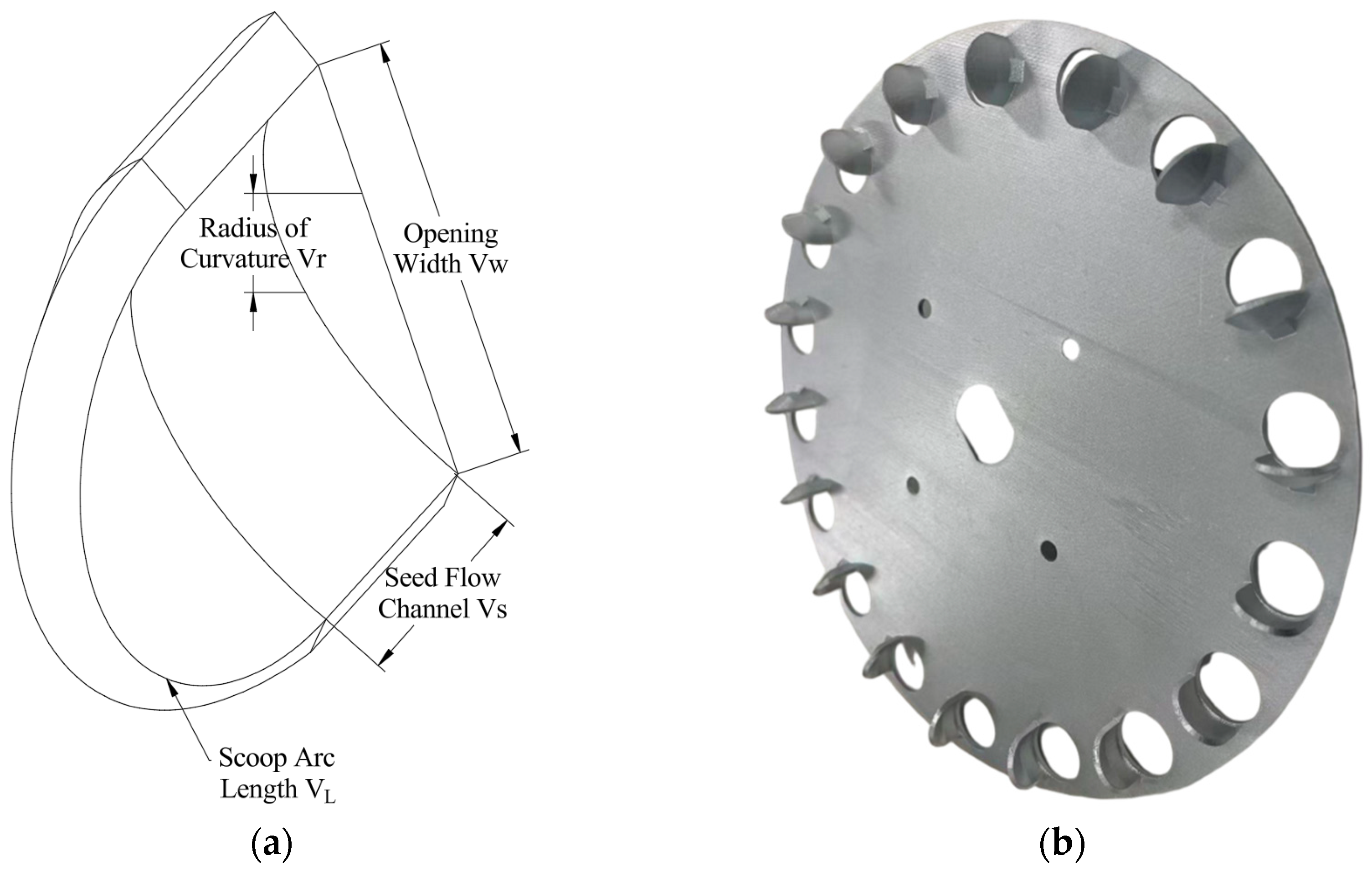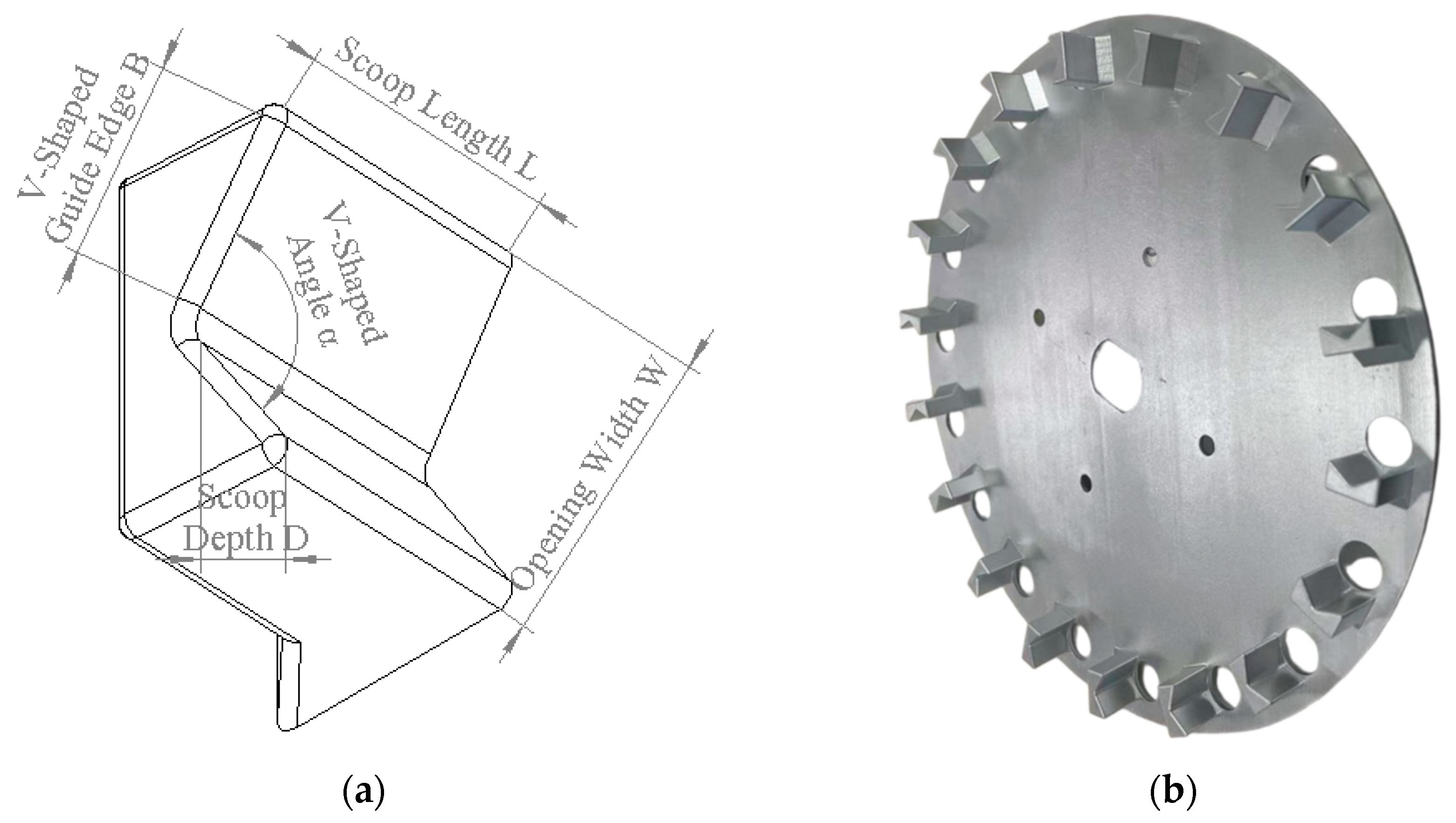 Based on the exploration results of the effective range of key scoop dimensions in preliminary tests, this study, when determining the final design parameters, has set the geometric dimensions within a performance-stable region that is insensitive to variations in seed physical properties. Preliminary evaluation indicates that within the natural variation range of seed particle size after soaking, the scoop structure can still maintain a single-seed pickup rate stable above 85%. It is on this basis that subsequent systematic bench tests have been conducted. This design addresses the size and shape characteristics of C. esculentus seeds after soaking, which tend to become nearly spherical. The V-shaped cross-section forms a tapered guiding channel through its two inclined sidewalls, allowing seeds of varying sizes to gradually align and achieve single-layer arrangement during the scooping process, thereby reducing the possibility of multiple seeds entering side by side. The edge structure generates stronger shear forces when rotating into the seed population. The pointed top design of the V-shape facilitates the rapid detachment of seeds from the scoop under gravity, shortening the migration time from the scoop to the seed drop outlet, making it suitable for high-speed operation.