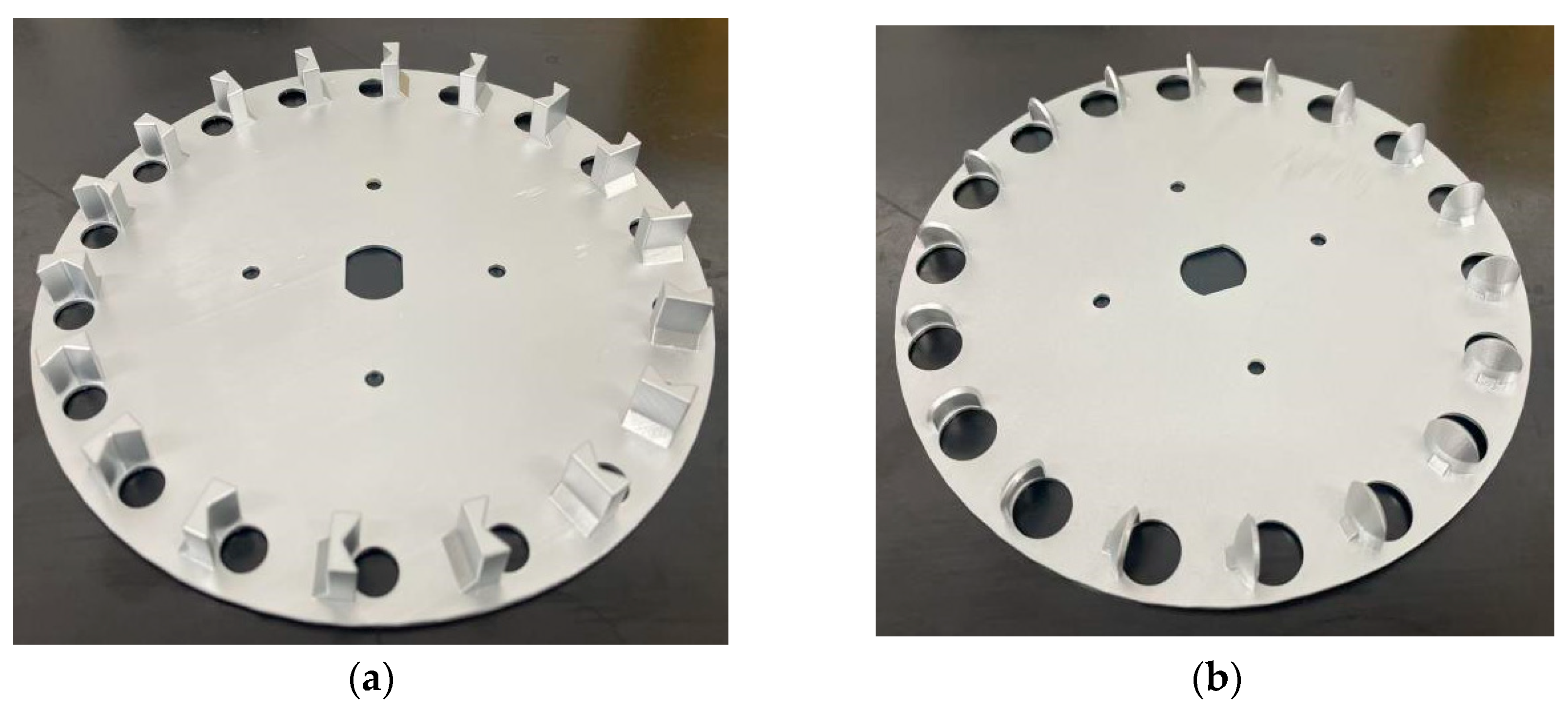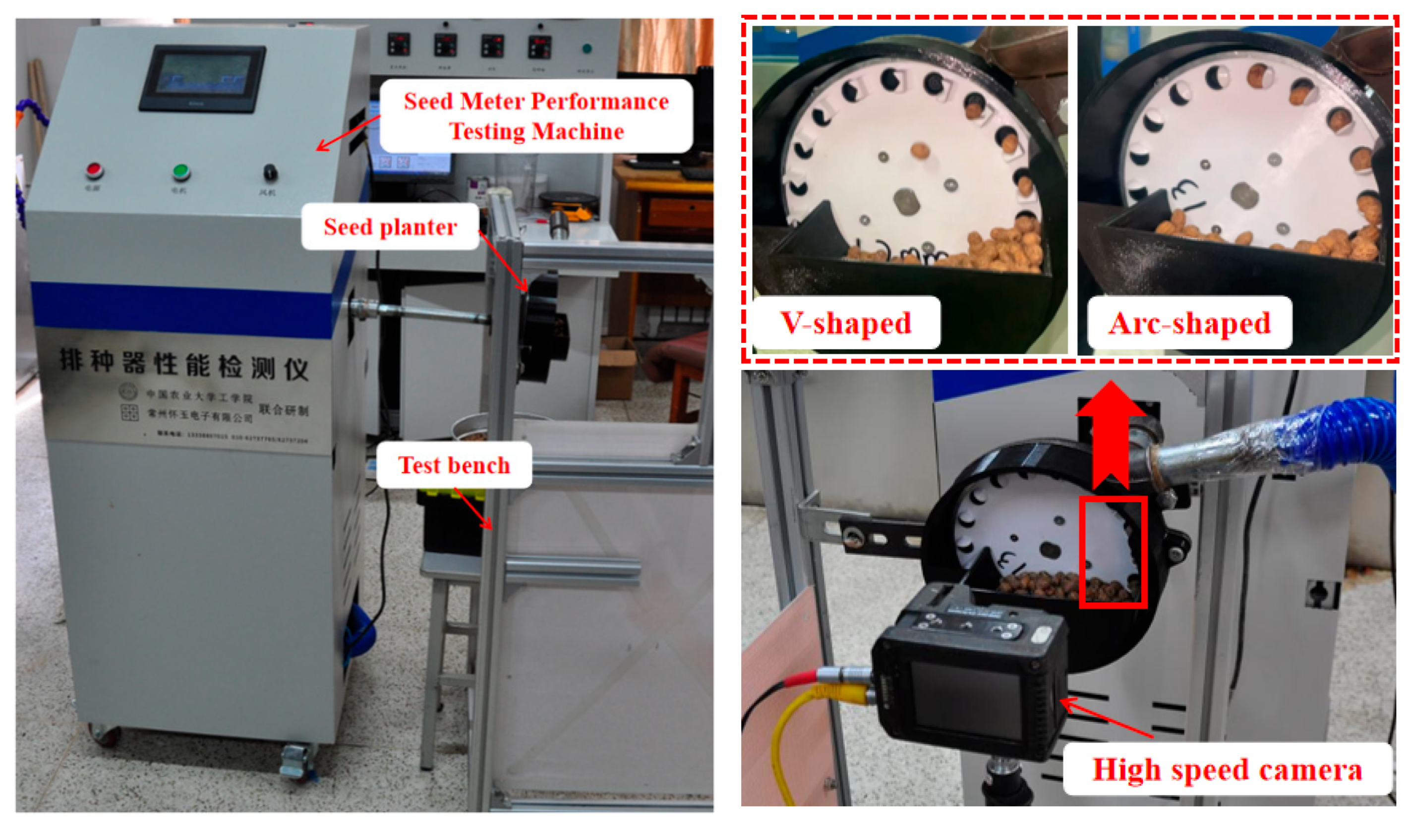 Except for the particle size grading tests, all experiments used batch seeds without additional screening to simulate actual seeding conditions. Each repeated test employed a fresh seed sample to avoid errors introduced by seed wear or changes in surface characteristics. Dry and wet state tests utilized seed batches with uniformly controlled moisture content to ensure consistency in seed properties within the same state. The rotational speed of the seed metering disc was monitored and regulated in real-time using a high-precision photoelectric encoder, ensuring that the deviation between the actual speed and the set value was less than ±1%. The system was calibrated before each test, and speed stability was maintained during operation. The test bench and the two tested scoop types are shown in