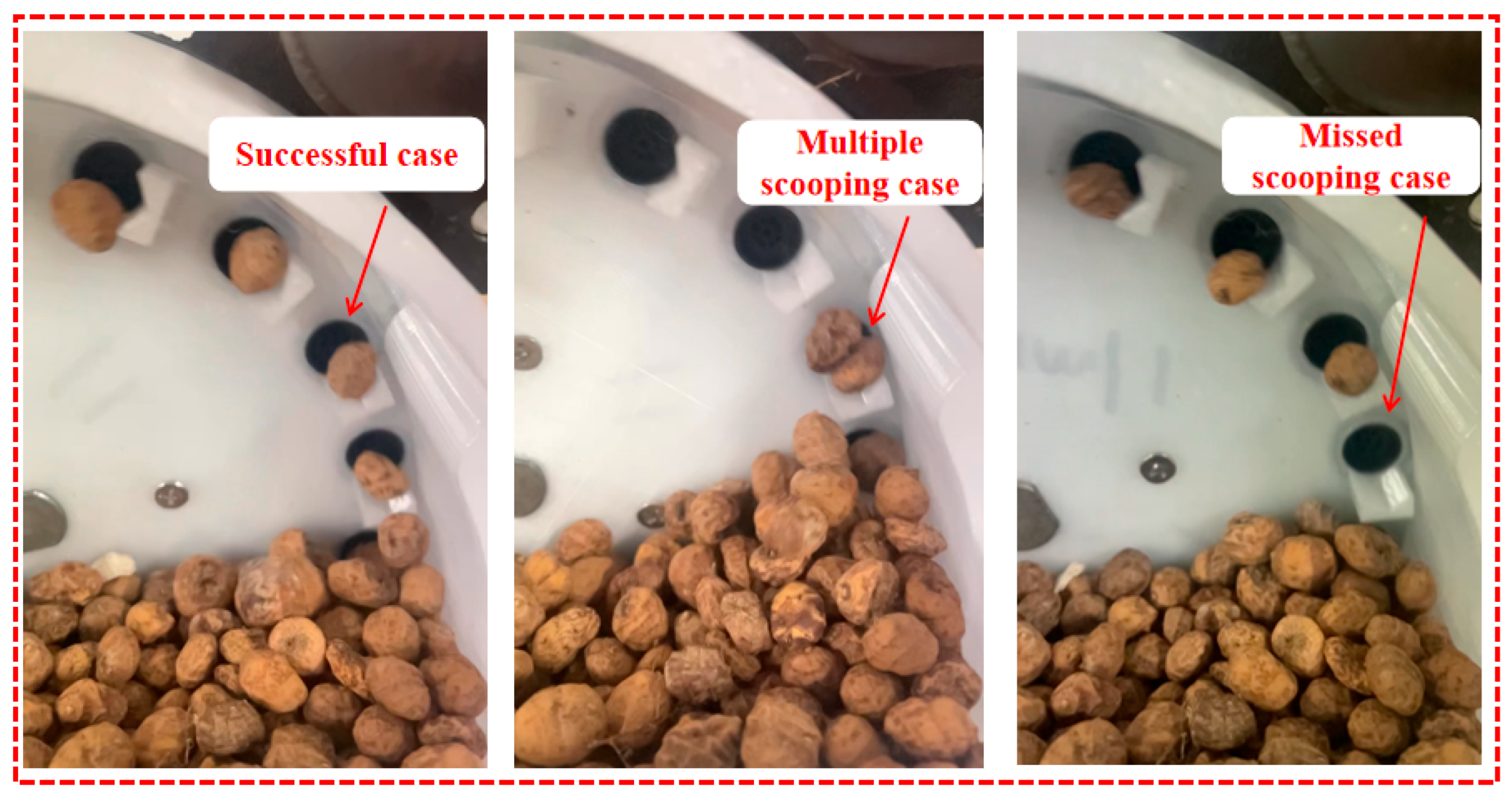 Based on the scoop configuration design and working mechanism analysis, this study conducted single-factor comparative experiments on scoop types (arc-shaped scoop and V-shaped scoop) using the rotational speed of the seed metering plate, the particle size grade of Cyperus esculentus seeds (large, medium, and small), and the dry/wet state of the seeds as experimental factors. The tests were driven by a PZQCSY-2 seed metering performance tester, with the seed metering plate rigidly connected to the scoop via a flange. No negative pressure was applied during this stage; only the mechanical scooping process was examined. The output speed of the tester was calibrated in real-time using a digital laser tachometer to ensure consistency between the set value and the measured value. The scooping process was recorded with a Phantom T1340 high-speed camera (1000 fps), and 100 consecutive scooping actions were collected after system stabilization. Each test group was repeated three times, and the results were averaged, with the single-seed pickup success rate (%) and the multiple pickup rate (%) used as evaluation metrics. The experimental data were organized using Microsoft Excel 2021, and independent samples t-tests (α = 0.05) were performed with SPSS 27.0 to analyze the significance of differences between groups. Double Y-axis bar charts were generated using Origin 2024 for visualization, with error bars representing the standard deviation of the three replicates.