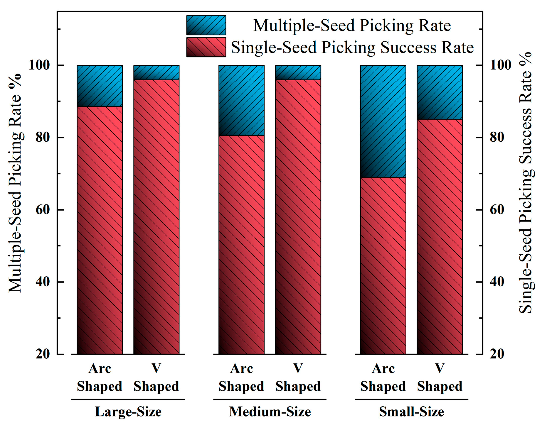 The core objective of this study is to propose and validate the geometric configurations of two scoop types (V-shaped and arc-shaped) and their impact on seed-picking performance, representing preliminary design research on a key component of the seed-metering device. Therefore, this work focuses primarily on the performance screening and operational mechanism analysis of the scoop itself, specifically investigating its working behavior under various rotational speeds, seed-size grades, and dry/wet conditions. In addition, discrete element simulation was employed to reveal the influence of the scoop structure on seed-group agitation behavior and movement velocity—these are fundamental factors affecting seeding quality. As for the comprehensive performance comparison with existing complete seeding devices, this has been incorporated into the team’s subsequent systematic research plan. In the next phase, the optimized scoop design will be integrated into a full prototype, and comparative experiments will be conducted under identical operating conditions with traditional air-suction seed-metering devices, thereby systematically evaluating the overall performance advantages of the “air-suction-scoop-assisted” design. Relevant findings are intended for publication in follow-up papers.