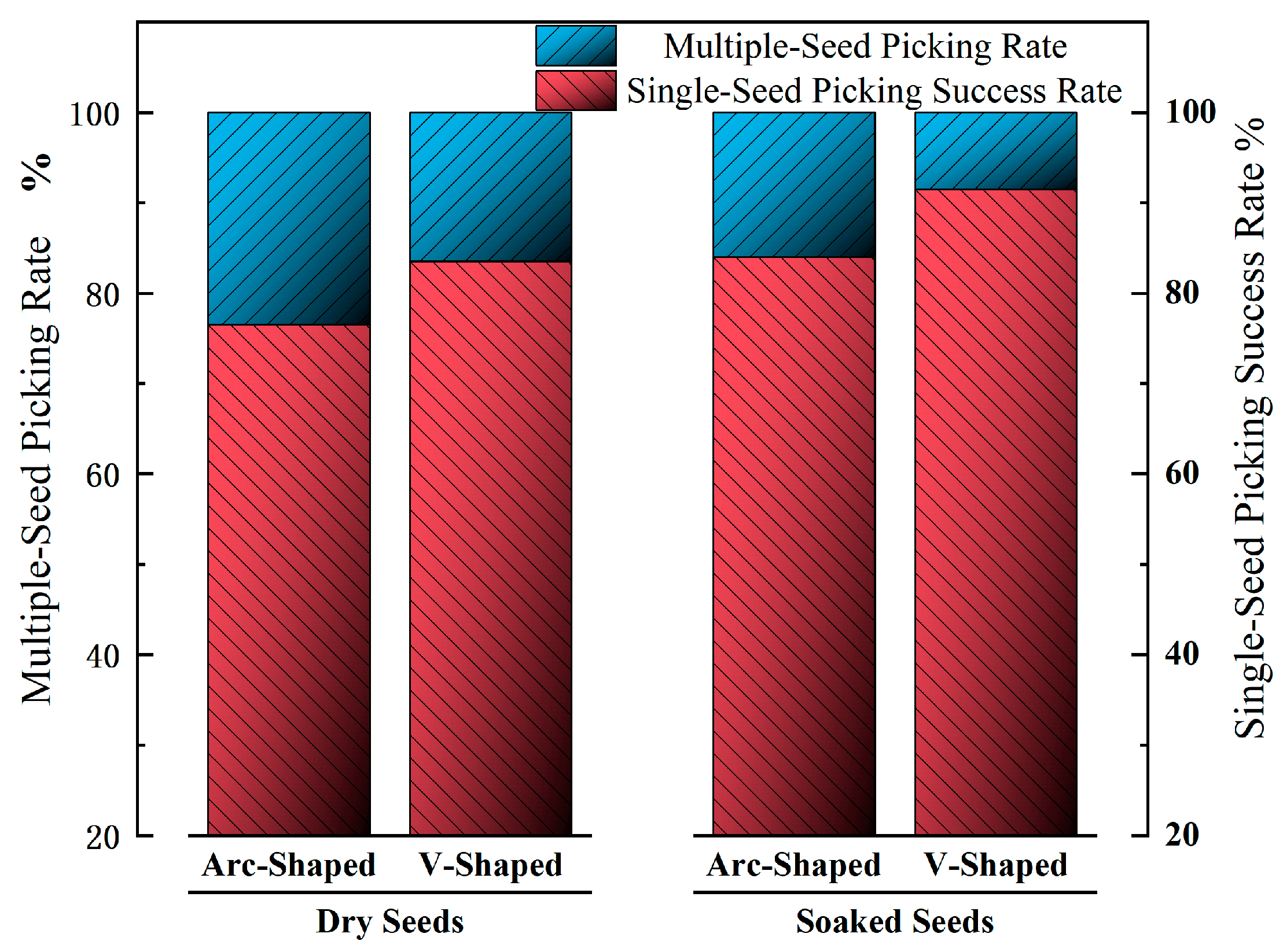 C. esculentus increased from 11.48 mm to 12.92 mm after soaking, while the sphericity improved from 88% to 92%. This morphological change significantly impacts seeding performance: the increase in sphericity indicates that the seed shape becomes more regular, facilitating more stable airtight contact with the suction holes during adsorption and thereby reducing the risk of detachment during seed transport. The enlargement of the equivalent diameter helps improve the single-seed filling effect during scoop-based seed pickup, particularly for smaller seeds, effectively reducing the occurrence of multiple seeds being captured by the scoop mechanism. In conclusion, both morphological changes induced by soaking have a positive impact on the seeding process.