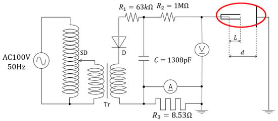 Figure 1 illustrates the experimental circuit employed in this study. The experimental system consists of two main components: an electric spark generation system and a measurement system. The spark generation system comprises a high-voltage power supply, including a variable autotransformer (SD) and a step-up transformer (Tr), an energy storage capacitor , and resistors , , and . The nominal values of the capacitor and resistors are 1328 pF and 1.02 MΩ, respectively, as measured using a Hioki 3531 Z HiTESTER (Nagano city, Japan). The resistors used are TKK ERBOBFH 1 MΩ K 501 types (Tokai Konetsu Kogyo Co., Ltd., Tokyo, Japan).
