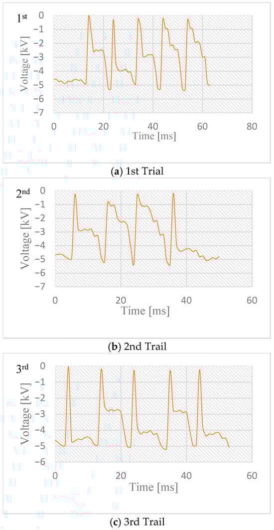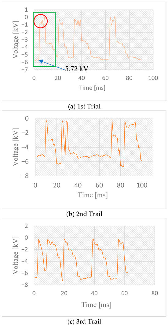 Voltage waveforms for the CRC. (a) first trial, (b) second trial and (c) the third trial. Dielectric breakdown ranges of 4.76–6.68 kV. The negative sign on the vertical axis emphasizes the polarity of the applied voltage.