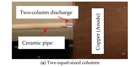 Figure 7 shows the plasma discharge for the CCC, beginning with a double-column discharge. This discharge is observed every time. Sometimes the columns seem to be of the same diameter, and sometimes their sizes differ visually (see Figure 7a,b). The creeping process can alter the location of the plasma along the ceramic pipe. The results show intense spark discharge for the CCC arrangement. It is observed that the position of the plasma striking the anode remains almost steady. At the same time, the double column can transition to a full electrode discharge (see Figure 7d) without changing the applied voltage.