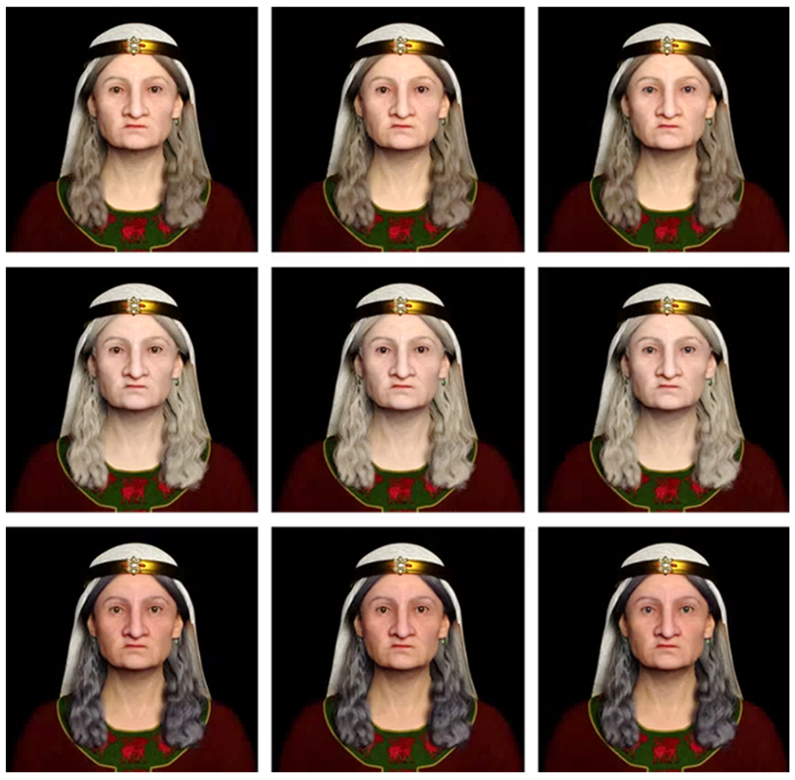 - Roughley, M.; Liu, C.Y.J.; Wilkinson, C.M.; Saleem, S.N. Using a morph-based animation to visualise the face of Pharaoh Ramesses II ageing from middle to old age. Digit. Appl. Archaeol. Cult. Herit. 2024, 35, e00377. [Google Scholar] [CrossRef]
