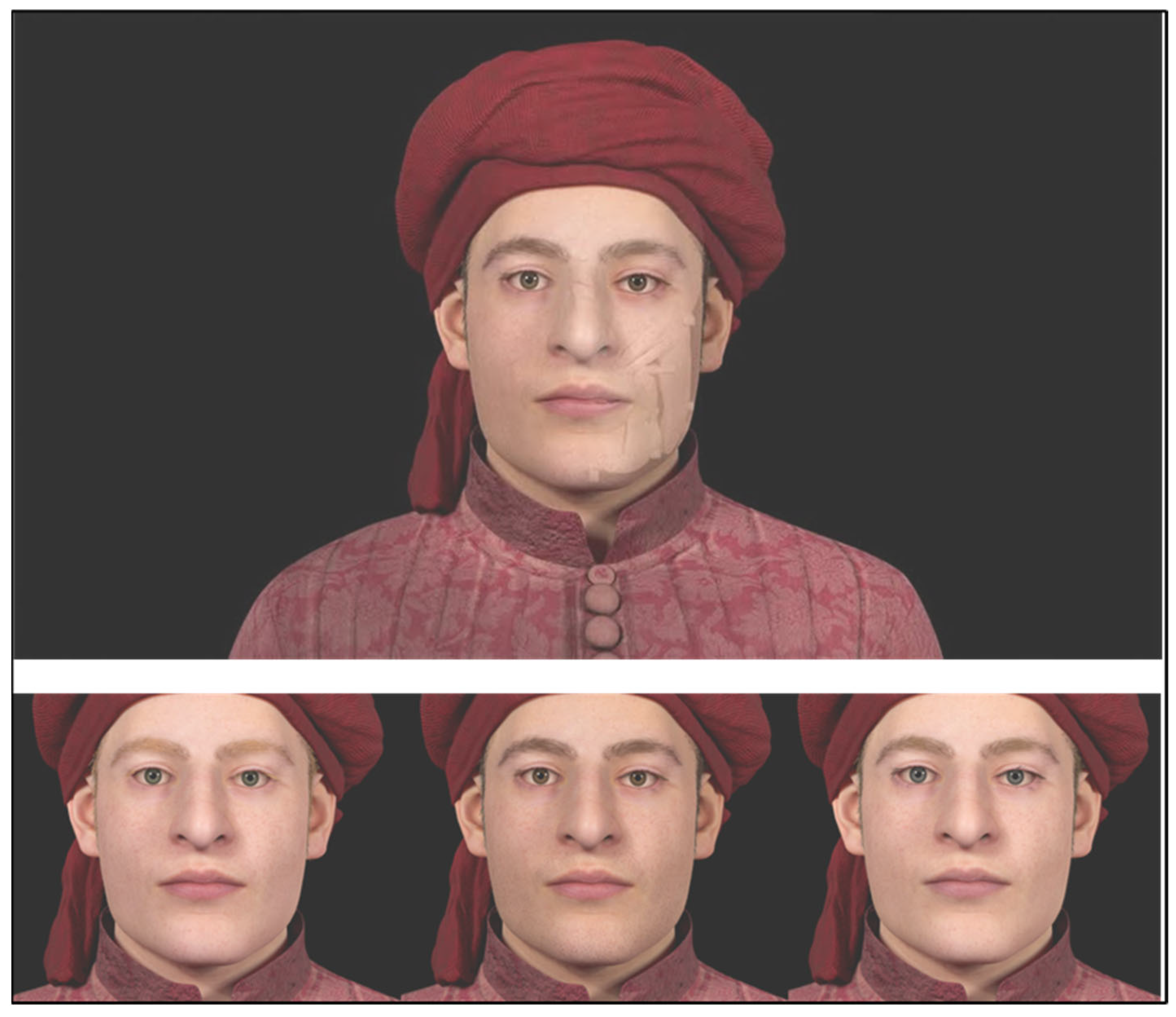 - Buti, L.; Gruppioni, G.; Benazzi, S. Facial Reconstruction of Famous Historical Figures: Between Science and Art. In Studies in Forensic Biohistory: Anthropological Perspectives; Stojanowski, C.M., Duncan, W.N., Eds.; Cambridge Studies in Biological and Evolutionary Anthropology; Cambridge University Press: Cambridge, UK, 2017; Chapter 9, Volume 75; pp. 191–212. ISBN 131694302X/9781316943021. [Google Scholar]