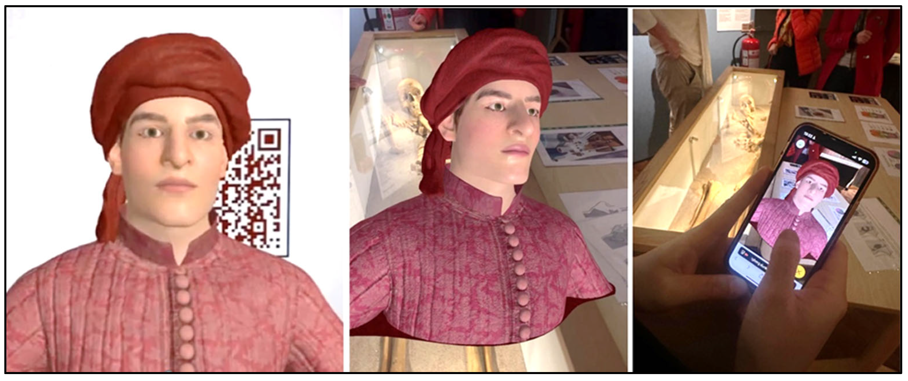 - Vanni, A.; Licata, M.; Fusco, R.; Rossetti, N.; Picozzi, M. Humanizing the past: A review on the role of facial approximation in museums and its public perception. Front. Environ. Archaeol. 2025, 4, 1591662. [Google Scholar] [CrossRef]