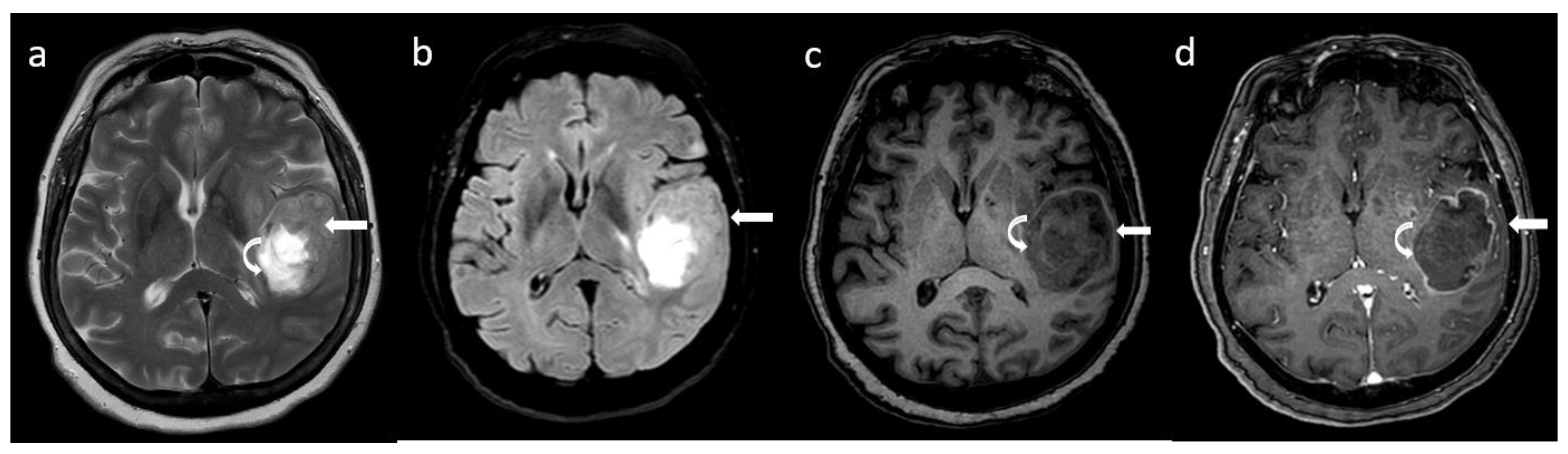 - Aleid, A.M.; Alrasheed, A.S.; Aldanyowi, S.N.; Almalki, S.F. Advanced magnetic resonance imaging for glioblastoma: Oncology-radiology integration. Surg. Neurol. Int. 2024, 15, 309. [Google Scholar] [CrossRef]