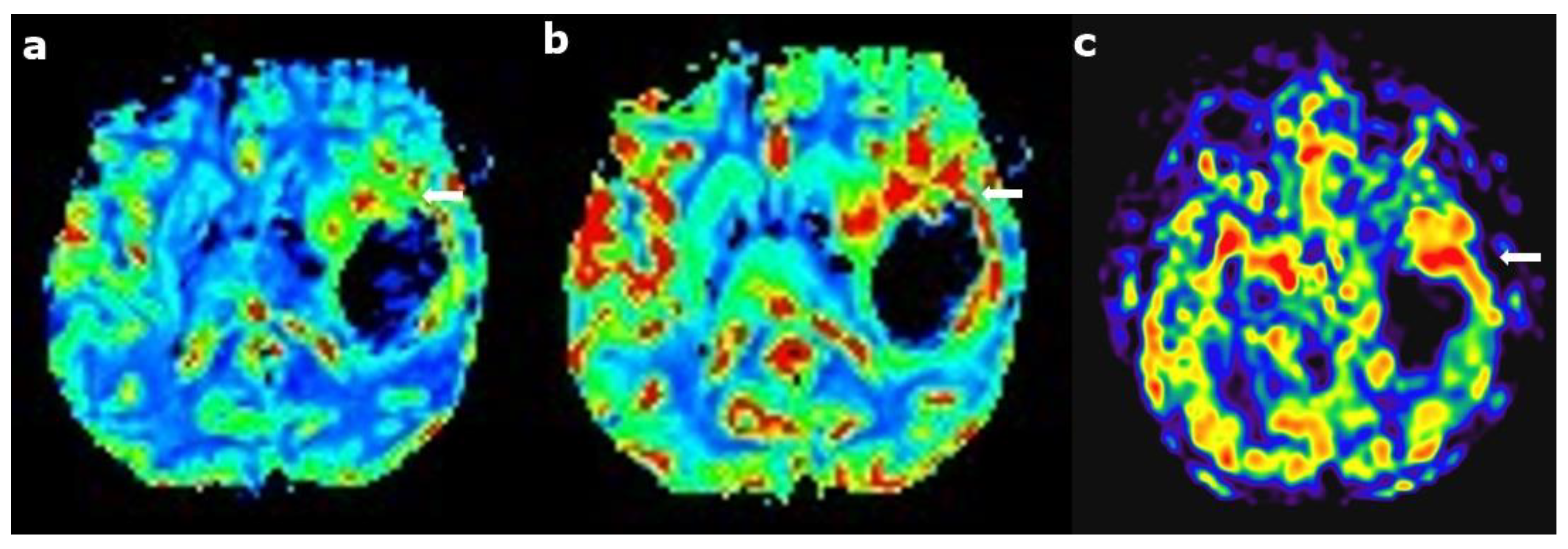- Griffith, B.; Jain, R. Perfusion Imaging in Neuro-Oncology: Basic Techniques and Clinical Applications. Magn. Reson. Imaging Clin. N. Am. 2016, 24, 765–779. [Google Scholar] [CrossRef]