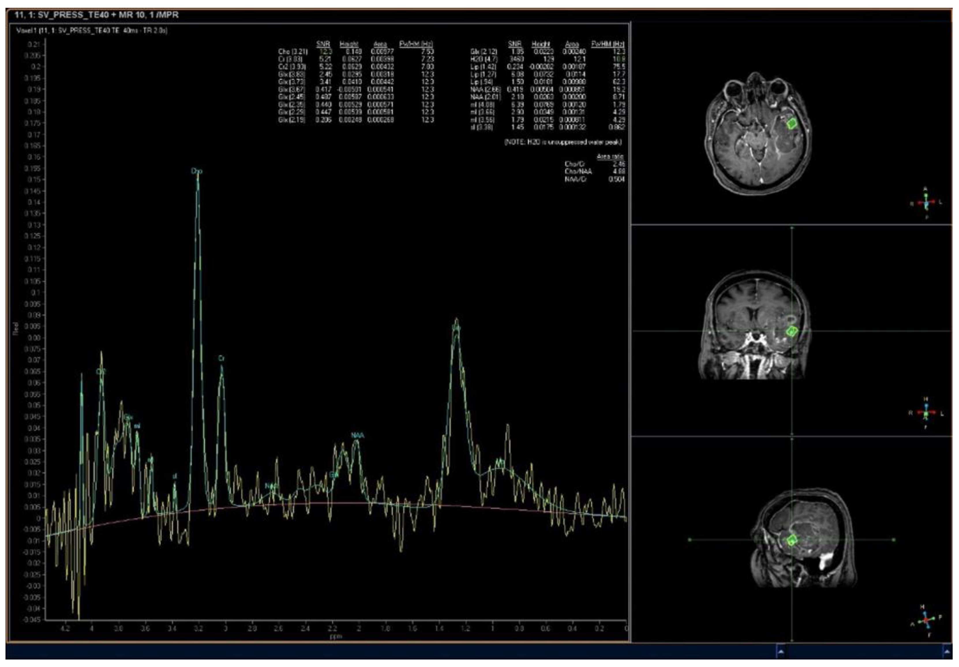 - Weinberg, B.D.; Kuruva, M.; Shim, H.; Mullins, M.E. Clinical Applications of Magnetic Resonance Spectroscopy in Brain Tumors: From Diagnosis to Treatment. Radiol. Clin. N. Am. 2021, 59, 349–362. [Google Scholar] [CrossRef]