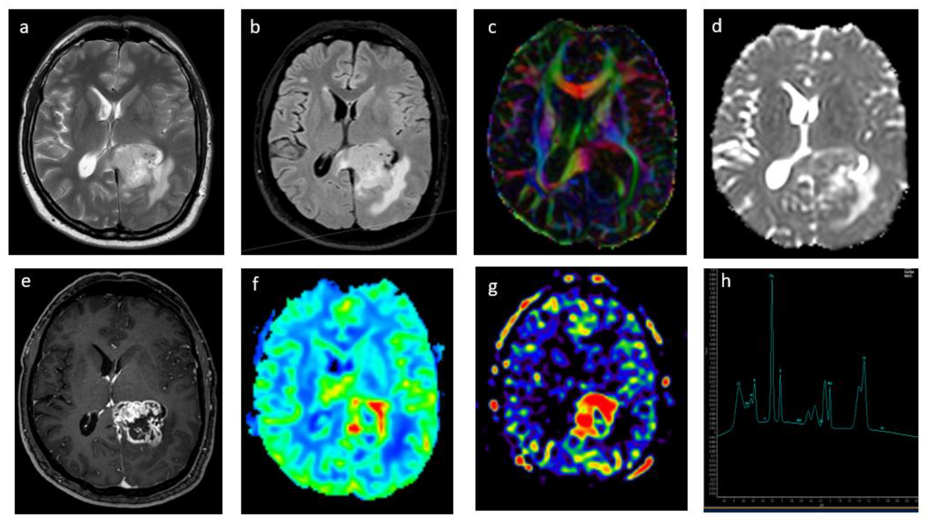| DTI/tractography | White matter tract integrity Infiltration patterns | Surgical planning Tract involvement | Sensitive to edema/crossing fibers Processing variability |