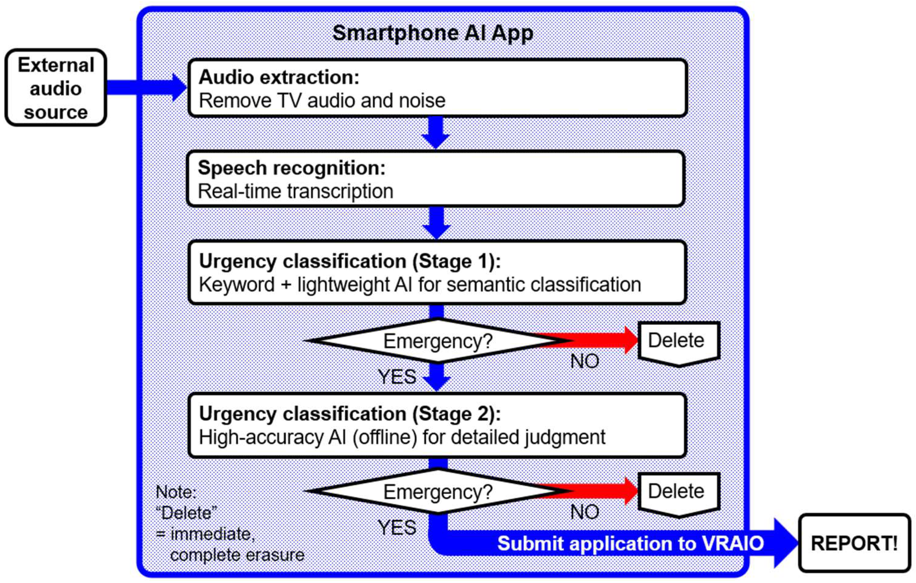 If the second stage also classifies the case as urgent, a reporting process is triggered via the Verifiable Record of AI Output (VRAIO) system. If urgency is denied at any stage, both audio and text data are immediately and completely deleted, with no output to the outside.