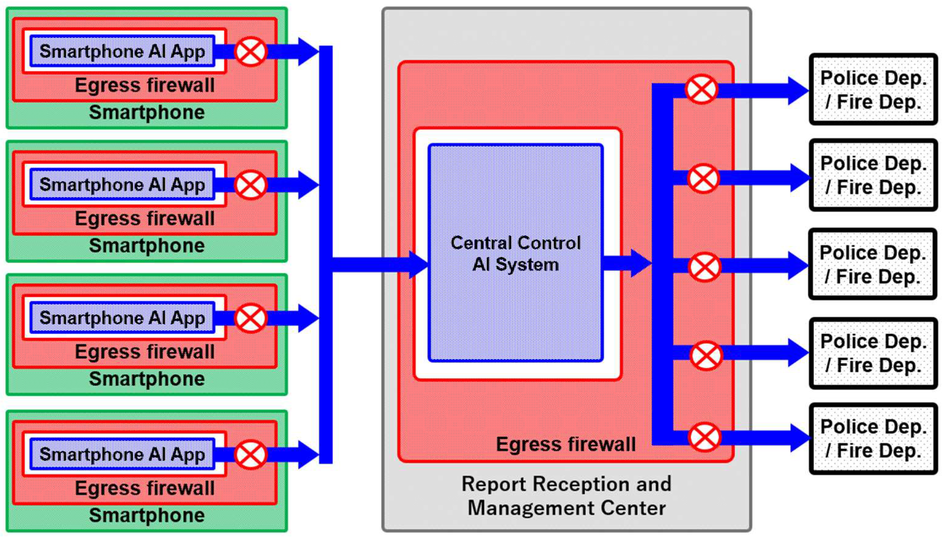 Nevertheless, during social trials and early deployment phases, direct notifications from smartphone-based AI applications or a central control AI system to enforcement agencies such as the police or fire departments should be approached with caution, particularly in light of the risks of false alarms and excessive notifications. Until the social reliability of AI-based automatic detection and decision-making has been sufficiently verified, it is desirable to introduce an intermediary organization that functions as a buffer between the AI systems and existing emergency services. This intermediary body is assumed to be established and operated by the entity leading the social trial—such as a governmental authority, a local municipality, or a company developing and providing the AI system—and would be responsible for human verification and organization of AI-generated alerts, forwarding them to existing emergency call networks only when deemed necessary.