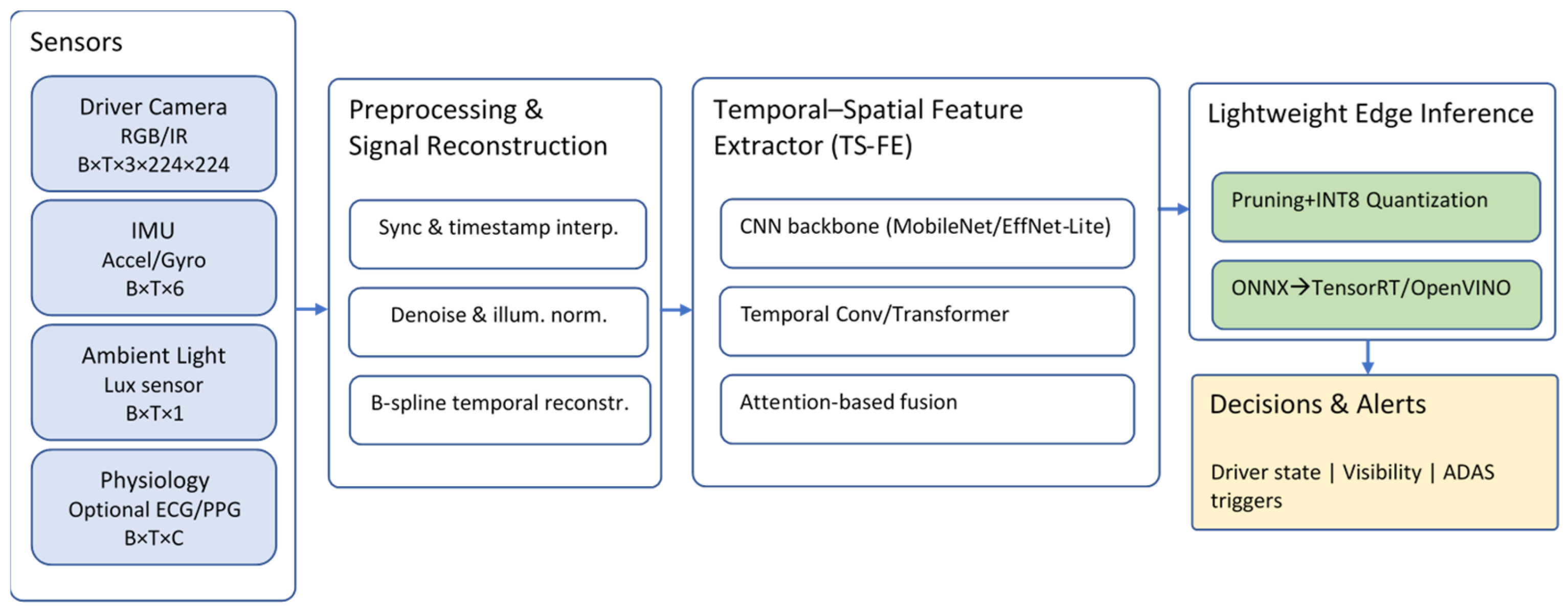 The framework’s temporal–spatial feature extractor (TS-FE) introduces a compact yet expressive architecture capable of representing driver-state dynamics and environmental visibility simultaneously—a form of cross-context modeling rarely addressed in lightweight deployments.