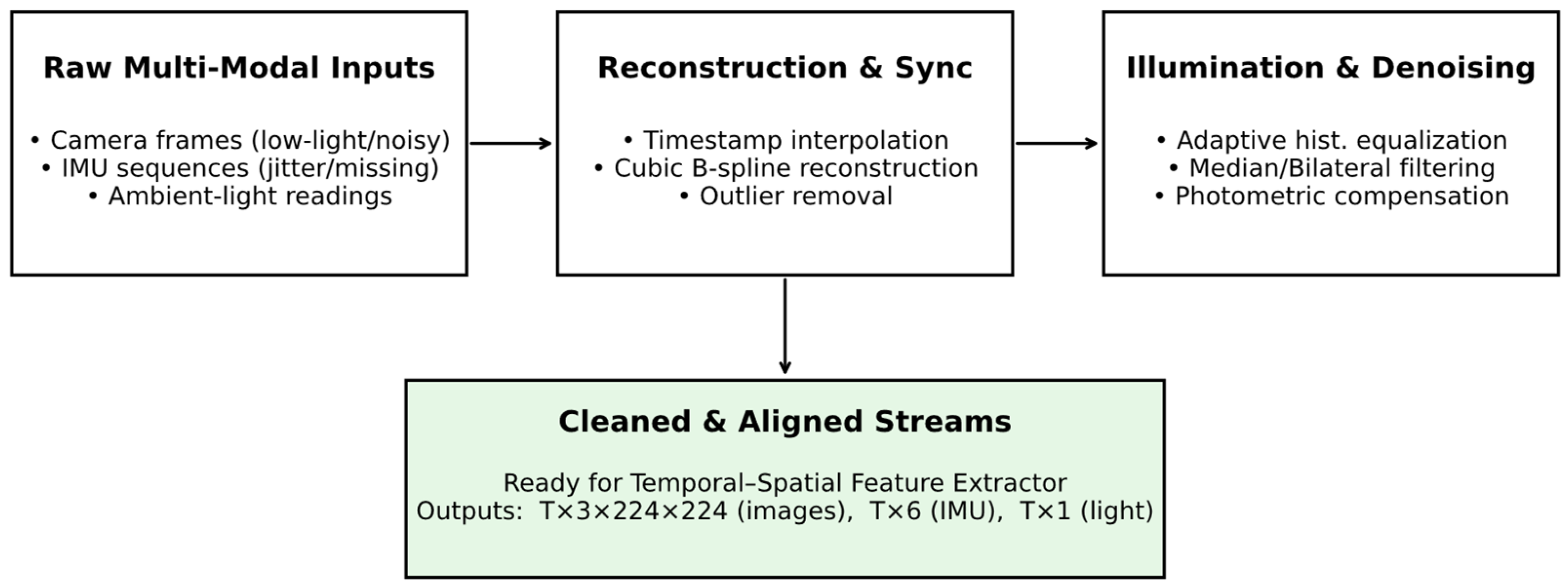 The output of this stage shall be synchronized, denoised, and illumination-compensated multi-modal signals ready for temporal–spatial feature extraction.