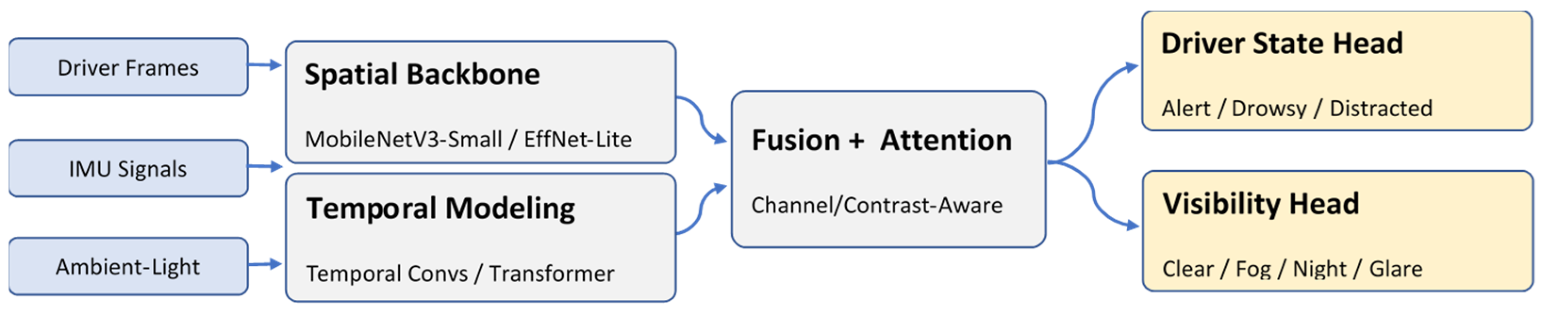 These observations clearly point to a gap for a lightweight, multi-modal, Edge AI framework that unifies driver state and hazard perception under low visibility, which is the objective of our proposed framework.