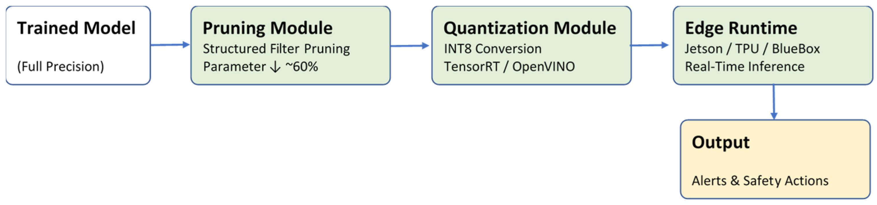 Model compression strategies (pruning, 8-bit quantization) enabling deployment on resource-constrained automotive-grade hardware with low latency and power overhead.