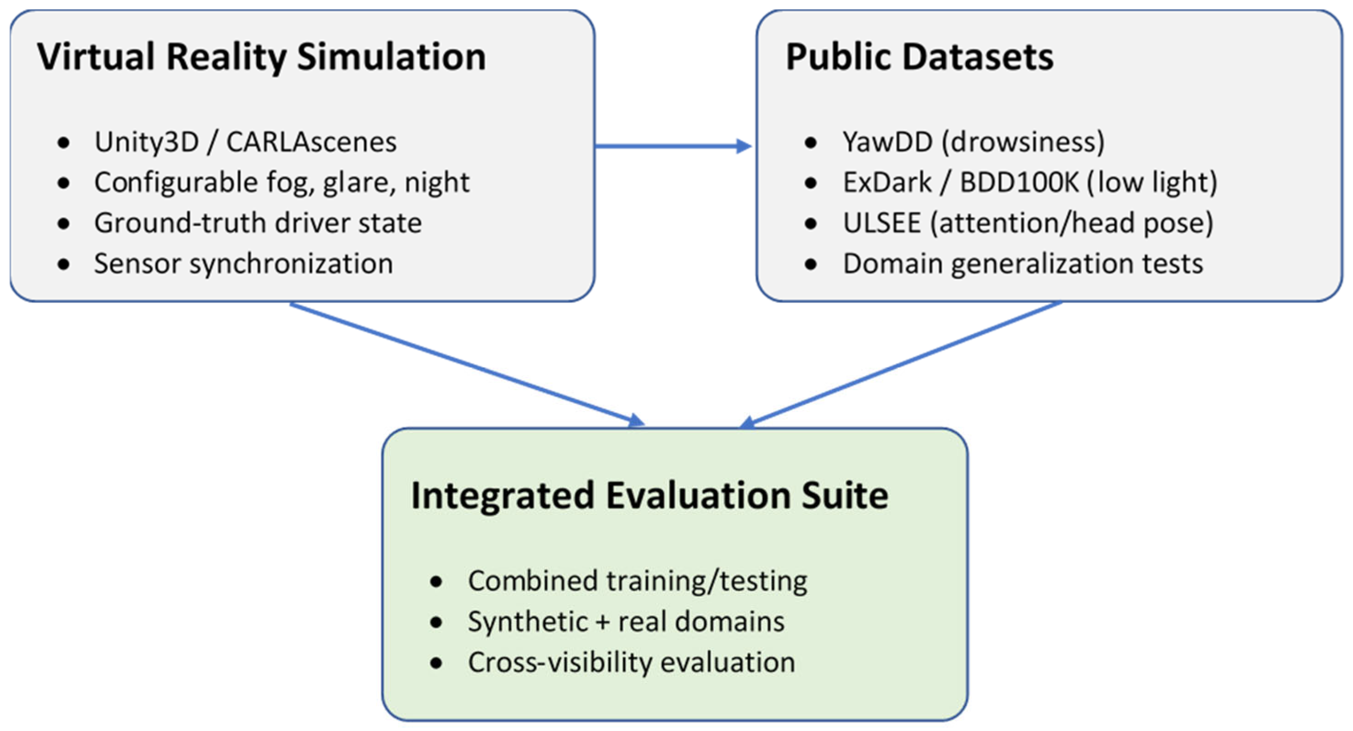 Despite these advances, several gaps remain: (i) many studies focus on accuracy under ideal conditions (good lighting, controlled simulator), (ii) there is limited work on embedded/edge deployment of DSM models with latency/power constraints, and (iii) fewer works address the coupling of driver state with external hazard perception (especially under low-visibility). These gaps motivate our framework’s focus on lightweight, integrated driver monitoring under challenging conditions.