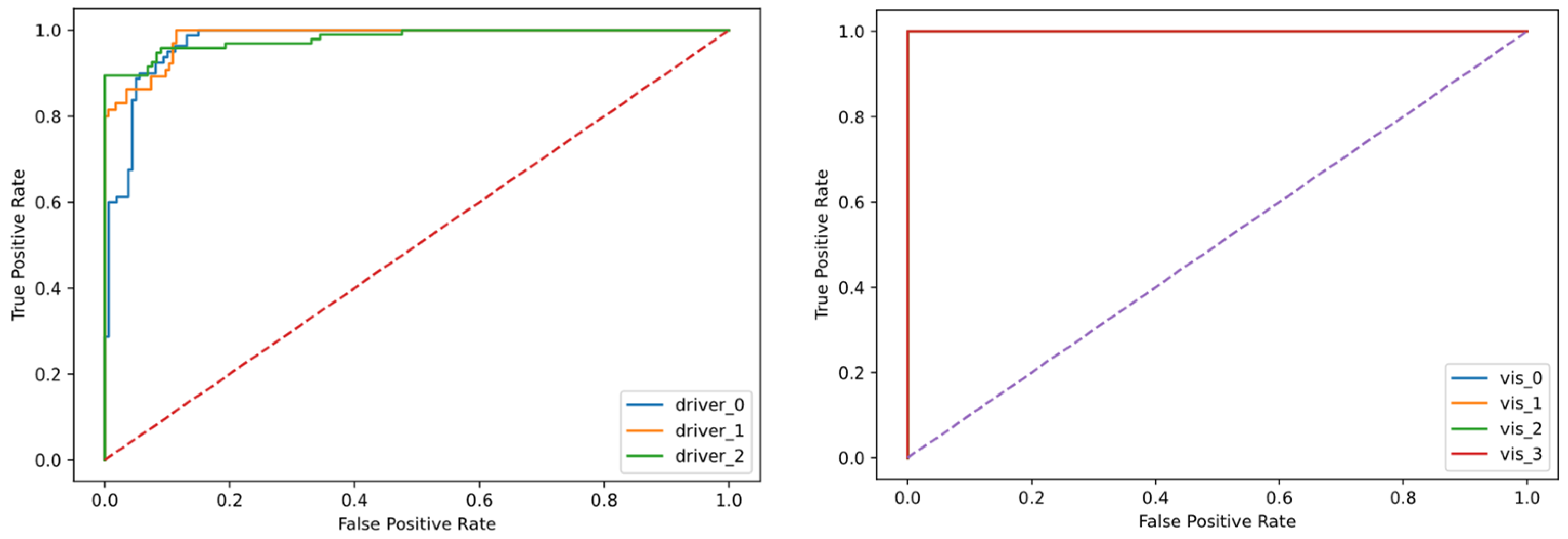 The ROC curves yield AUC = 0.983 for driver-state and AUC = 1.000 for visibility classification, indicating strong separation between positive and negative classes.