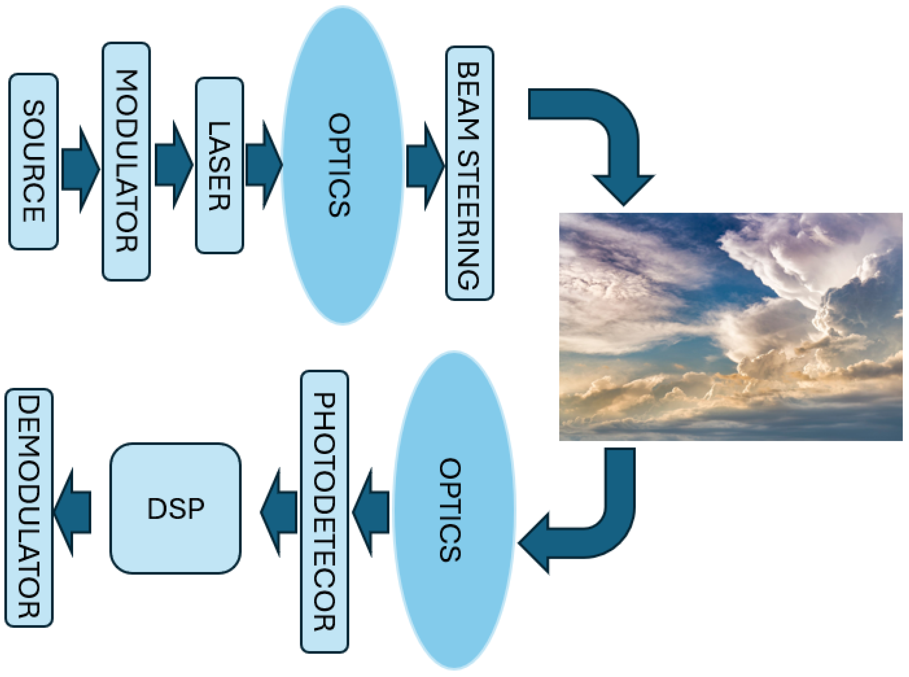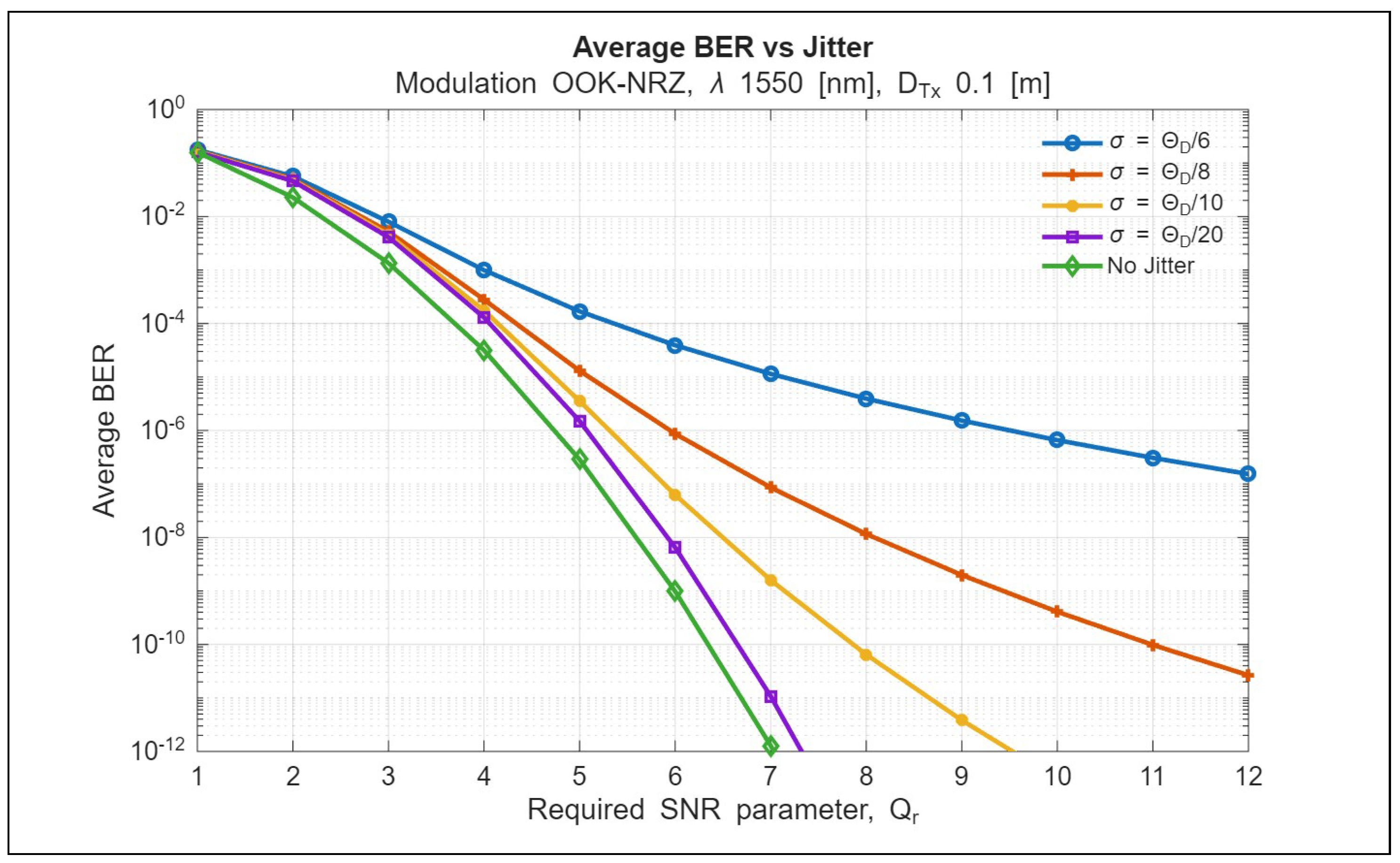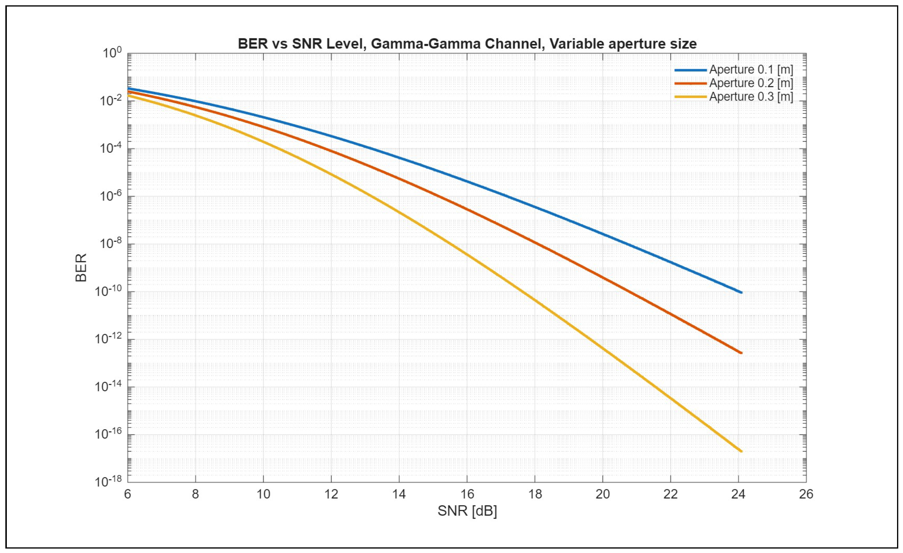 - Wavelength and spatial diversity are alternative solutions when the line of sight is mainly affected or obstructed by atmospherics, e.g., clouds, fog, or rain. An experimental demonstration of an improvement of the Q factor (30) is in [116]. Additionally, in the aerial scenario, the platform can use multiple apertures on the transmitter or receiver side for diversity, and this technique has also been shown to allow path loss mitigation, increasing the SNR at the receiver. The use of N apertures reduces the scintillation index by a factor .