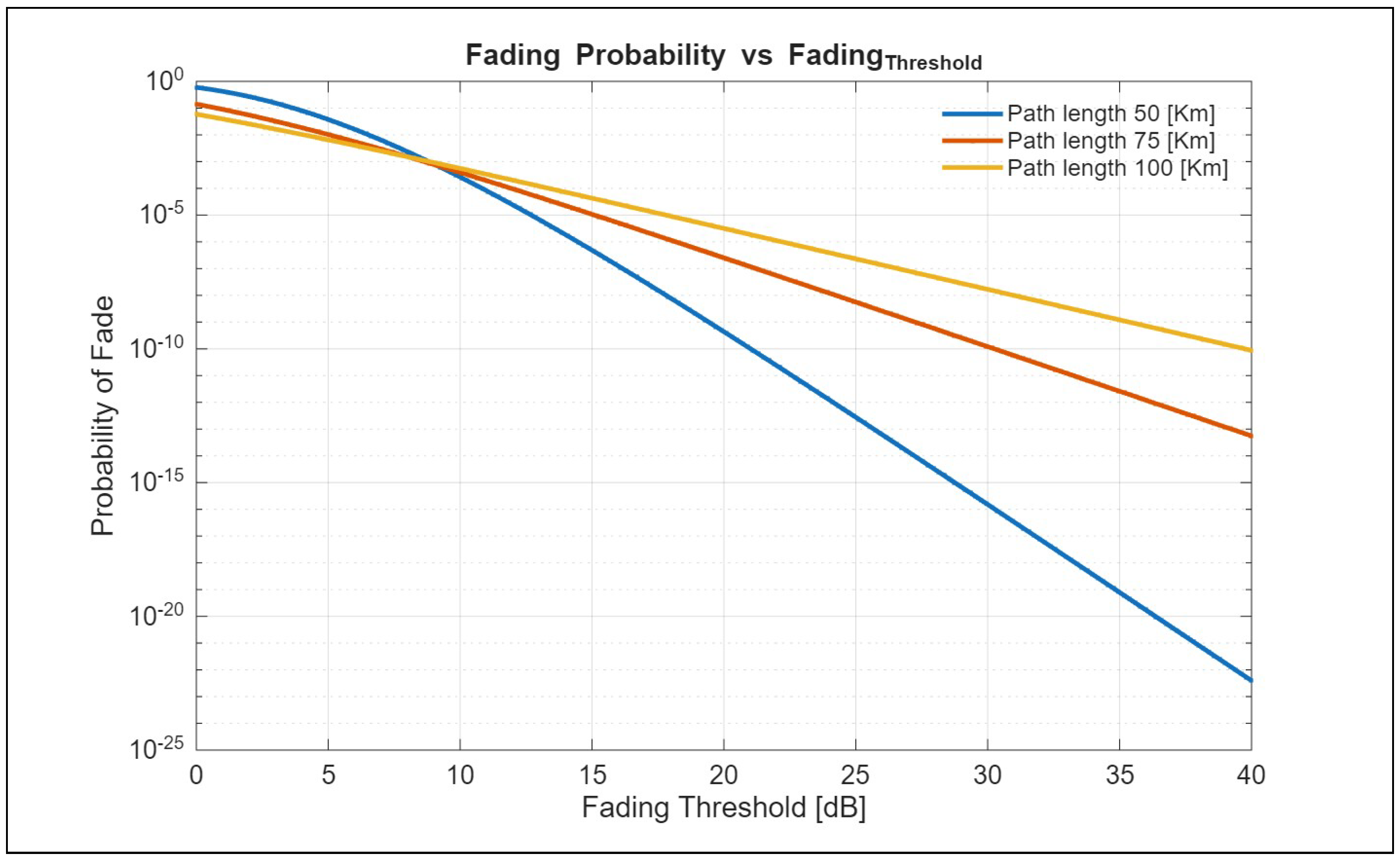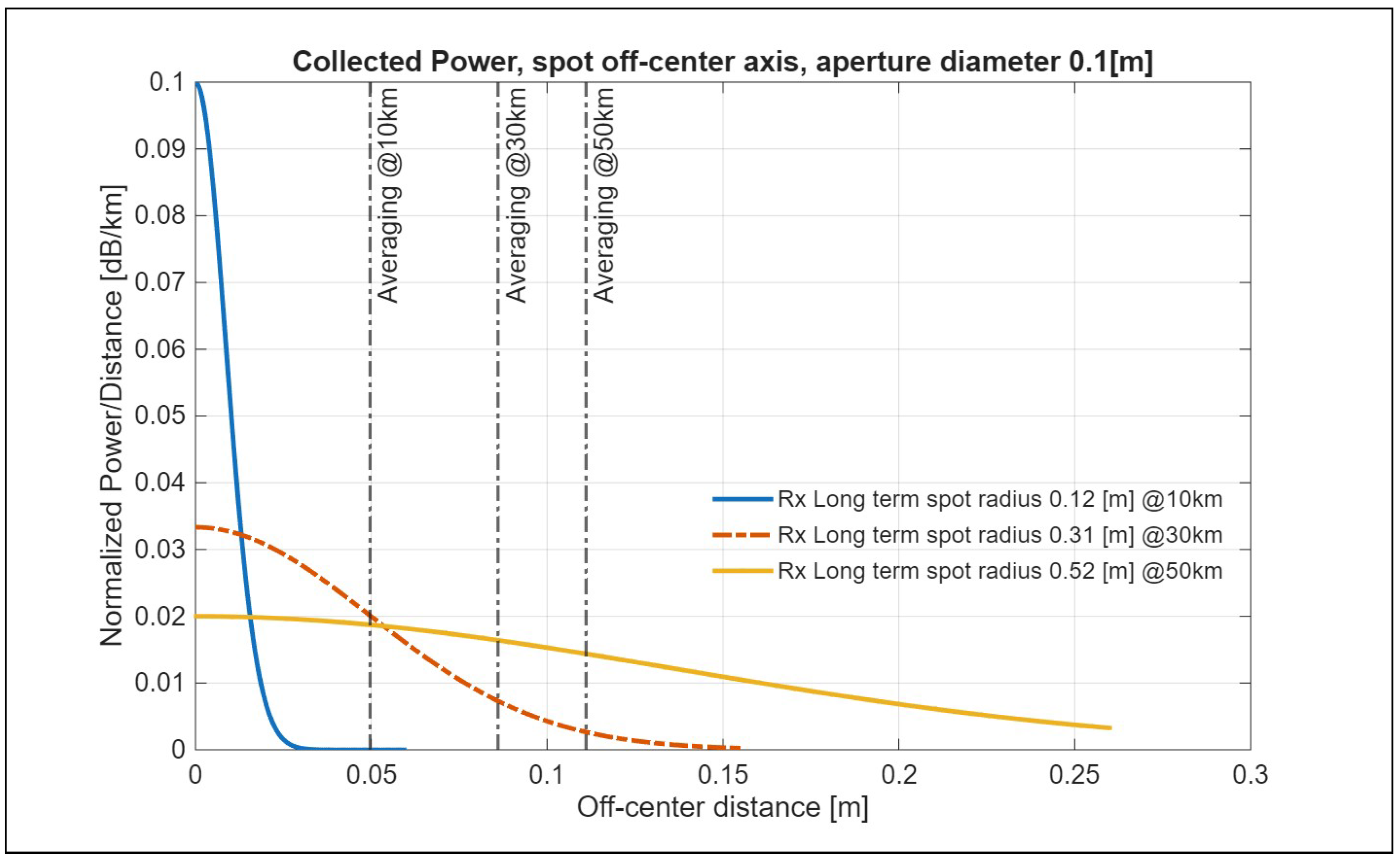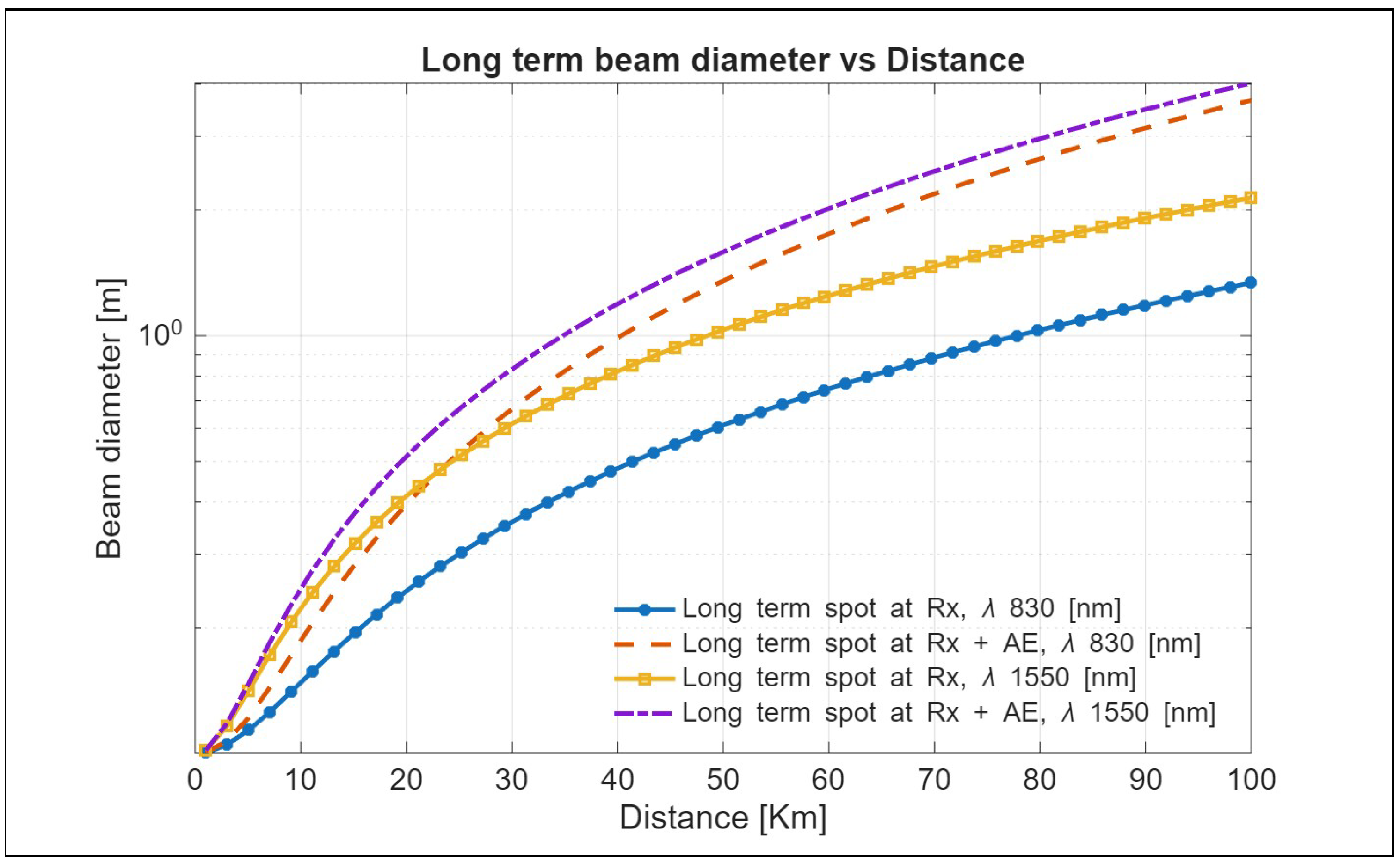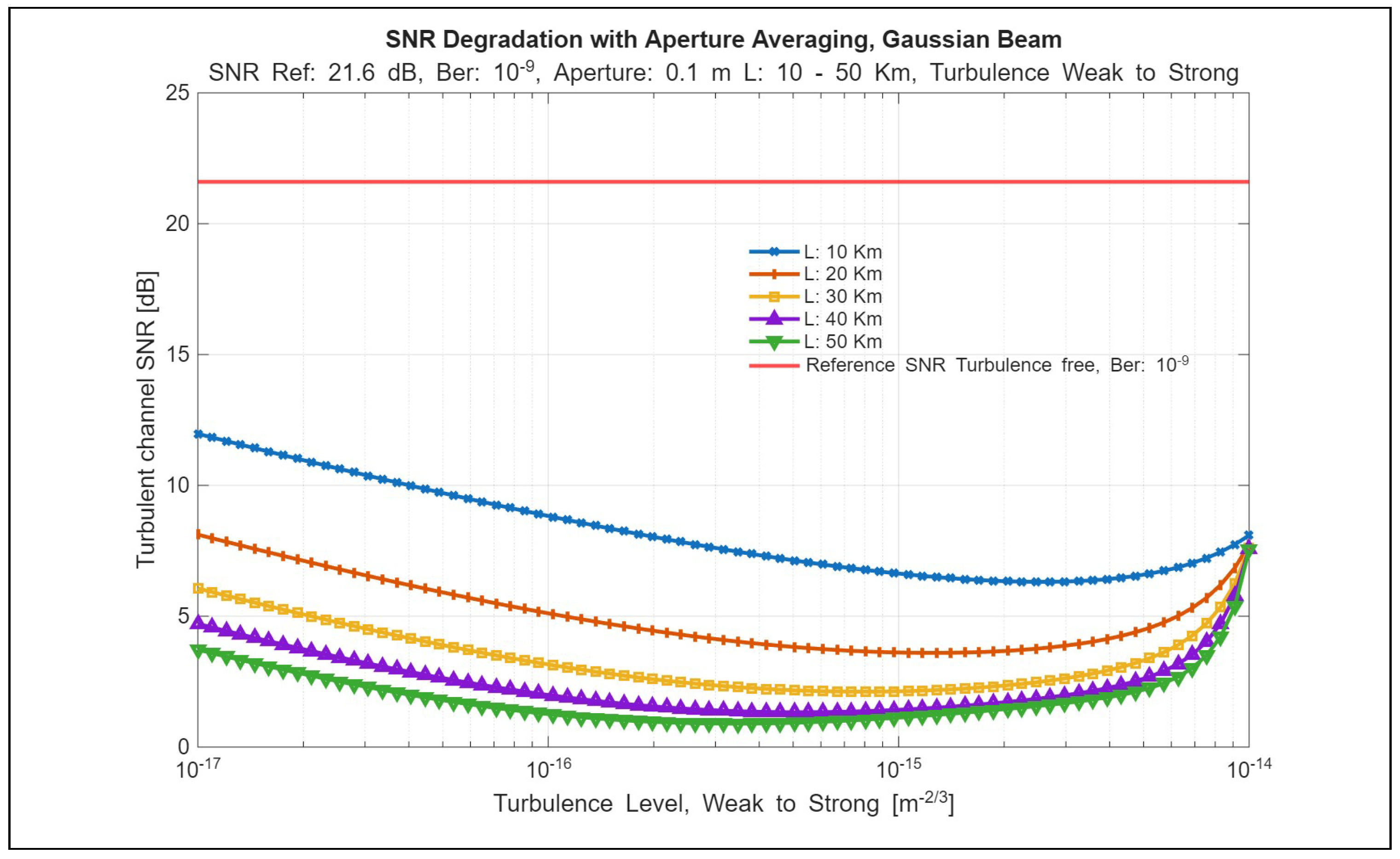 - Aperture averaging reduces the scintillation index and fading effects, which can be achieved by increasing the receiver optical aperture diameter beyond the correlation width of the irradiance fluctuation, given by the Fresnel relation [110], to have good heterodyne efficiency. This technique has been studied on horizontal and satellite downlinks [111]. Figure 6 shows the average threshold radius for a Gaussian spot considered at that distance from the launch optic.