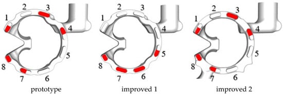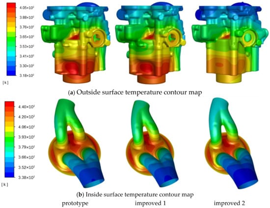 Figure 4 shows a comparison of the simulation results for three different schemes under identical boundary conditions. Overall, the body temperature of the improved scheme is significantly lower than that of the original scheme, with the improved scheme 2 having the lowest temperature. Taking the maximum temperature at the spark plug as an example, the original scheme was 404.9 K, improved scheme 1 was 402.3 K, which is a decrease of 2.6 K compared to the original scheme, and improved scheme 2 was 396.5 K, a decrease of 8.4 K compared to the original scheme. It can be seen that the improved scheme has a significant effect on improving the high-temperature area near the combustion chamber. The temperature differences between the intake and exhaust sides of the original scheme, improved scheme 1 and improved scheme 2 were 70.3 K, 63.8 K and 56.3 K, respectively. It can be observed that improved scheme 2 performs best, reducing the maximum temperature difference by 14 K. Improved scheme 2 meets the design requirements, reduces the thermal stress caused by temperature difference and is beneficial for reducing cylinder wear.