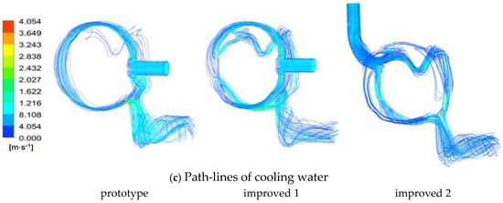 Figure 5a shows the cooling water jacket temperature, with the maximum temperature of the original scheme, improved scheme 1 and improved scheme 2 being 396.1 K, 388.8 K and 385.8 K, respectively. It can be seen that the heat transfer performance of the improved schemes has significantly improved, with the boiling heat exchange effect of improved scheme 2 being the best. The maximum wall superheat of the water jacket in improved scheme 2 is the smallest, and within a certain range, improved scheme 2 can better avoid the film boiling caused by excessive superheat.