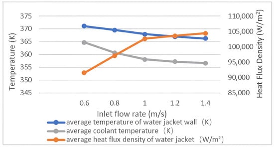 Using the same boiling heat transfer model, we simulated the heat transfer process of coolant with an inlet temperature of 354.15 K and inlet flow rates of 0.6 m/s, 0.8 m/s, 1.2 m/s and 1.4 m/s in the water jacket. The average temperature of the water jacket, the average temperature of the coolant and the average heat flux density of the water jacket are shown in Figure 7. All data shown in Figure 7 were acquired from a single Fluent simulation.