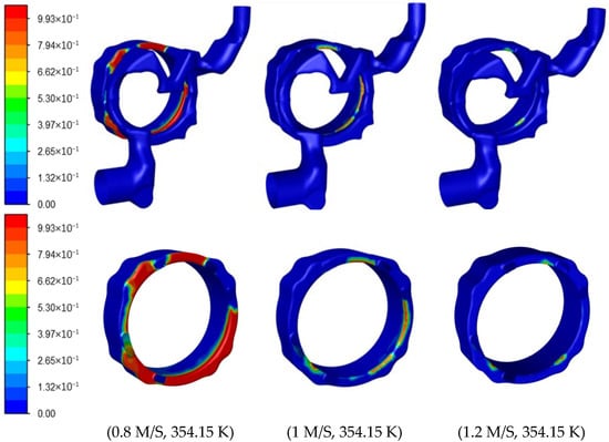 Figure 8 shows the boiling distribution within the water jacket at different flow rates. The figure indicates that the boiling bubbles are primarily distributed on the upper wall surface of the cylinder’s water jacket. Under the effects of convective transport and buoyancy, the boiling bubbles detach from the heating wall surface and converge in the low-flow rate area near the water-separating gasket, forming a localized bubble accumulation zone. When the inlet flow rate is 0.8 m/s, the bubble accumulation area is larger and the wall temperature is also higher. When the inlet flow rate increases to 1.2 m/s, the bubble accumulation area significantly decreases and the wall temperature drops. It can be seen that, consistent with the results in Reference [21], the vapor fraction decreases as the flow rate increases.