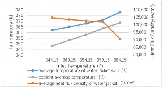 Using the same boiling heat transfer model, we simulated the two-phase boiling flow heat transfer process in a water jacket with an inlet flow rate of 1 m/s and inlet temperatures of 344.15 K, 349.15 K, 354.15 K, 359.15 K and 364.15 K, respectively. The average temperature of the water jacket, the average temperature of the coolant and the average heat flux density of the water jacket are shown in Figure 9. The data in Figure 9 were all acquired from a single Fluent simulation.