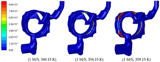 Figure 10 shows the distribution of coolant bubbles at different inlet temperatures. Different inlet temperatures lead to differences in wall superheat, which in turn affect boiling within the water jacket. As the temperature rises, the number of boiling bubbles in the water jacket increases and the area of bubble aggregation enlarges. If the inlet temperature continues to increase, it may lead to the occurrence of local film boiling, deteriorating heat transfer. When the inlet temperature is too low, boiling phenomena are rare and cannot fully utilize the heat transfer enhancement capability of two-phase boiling. As shown in Figure 10, bubbles gather near the water splitter gasket. This is a phenomenon of subcooled boiling with bubble aggregation in narrow channels. When controlling this kind of boiling, attention should be paid to the disturbance of convective motion. This disturbance may change the flow and distribution of the coolant within the water jacket.