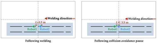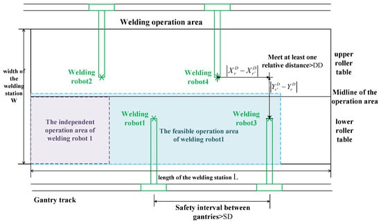 (3) The feasible working area constraint. A welding task i can be assigned to robot r only if both endpoints of the weld seam fall within the robot’s feasible working area, at this instant . This is formulated as Equation (4).